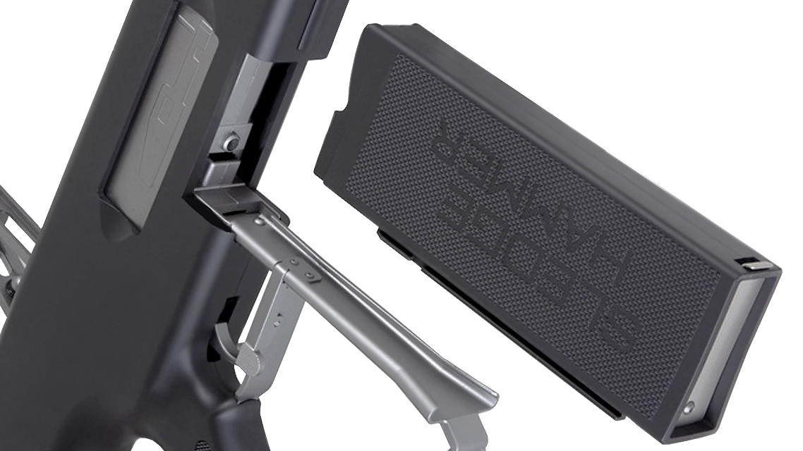 The drum magazine is produced as optional magazine. Its power-operated system takes in BB bullet by pushing the switch at the magazine bottom. Magazine capacity is over 3,000 rounds. (Sold Separate/ Package Not Include)