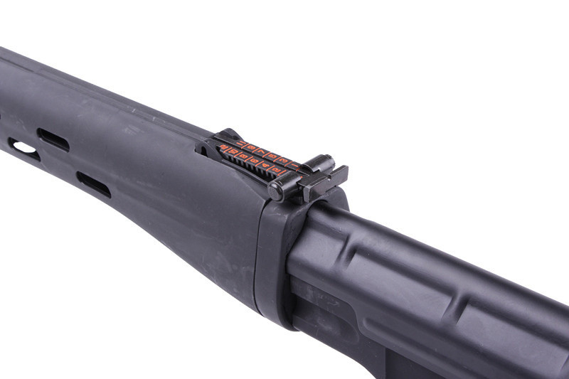 This high quality sniper rifle is made by the CM. In the production process enriched aluminum was used, in addition to polymer and steel. The outer barrel, along with the frontsight mount, flash hider and main body were mad from aluminum while ejection cover, magazine, butt plate and many small elements (including fire selector) were made from steel. The stock and front handguard were made from black polymer. Additionally stock is fitted with comfortable cheek pad.