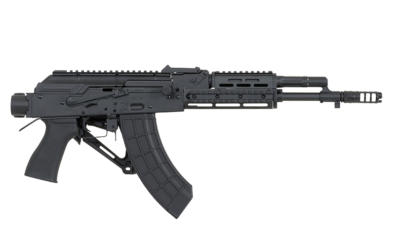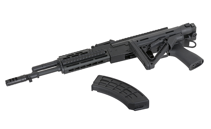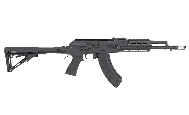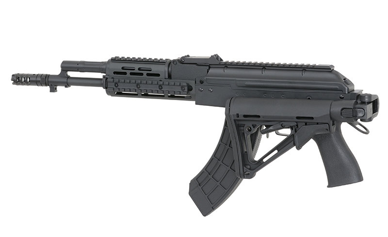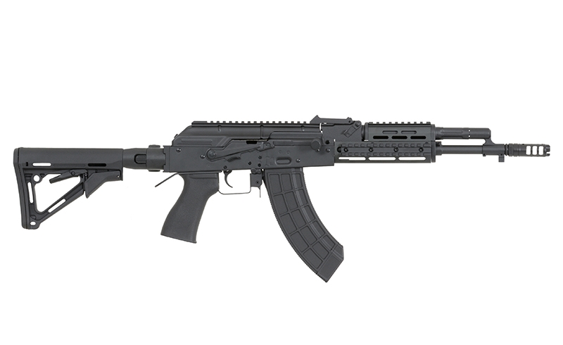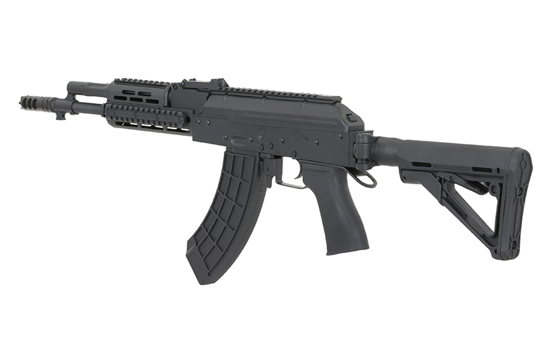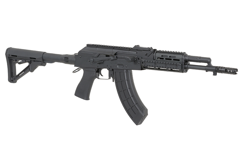 Replica of the new series of AK assault rifles. These rifles are produced in many specifications that include civil or military. Receiver, receiver cover, external barrel, safety lever, rear sight base, trigger, gas port block, gas cylinder, bolt carrier, front sight base and muzzle brake are made of steel and aluminum, that made the replica is more realistic.