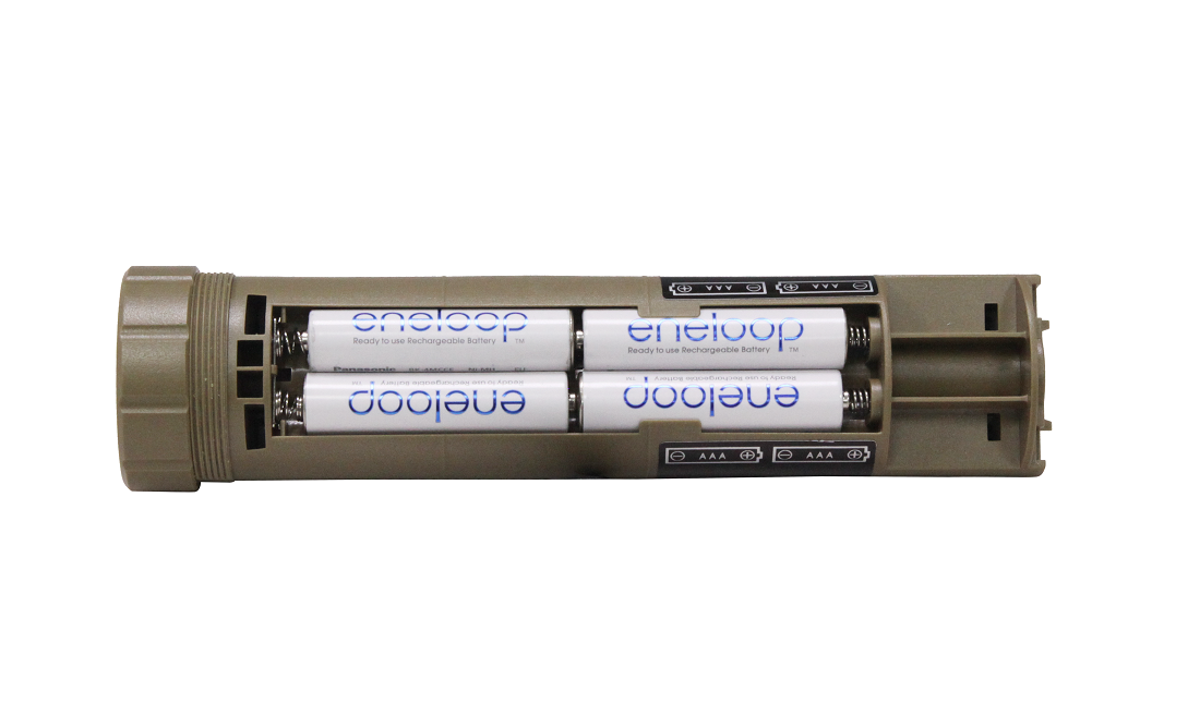 Use 4 AAA alkaline batteries lasting for 20,000 rounds, or use 4 eneloop rechargeable AAA batteries lasting for 100,000 rounds.