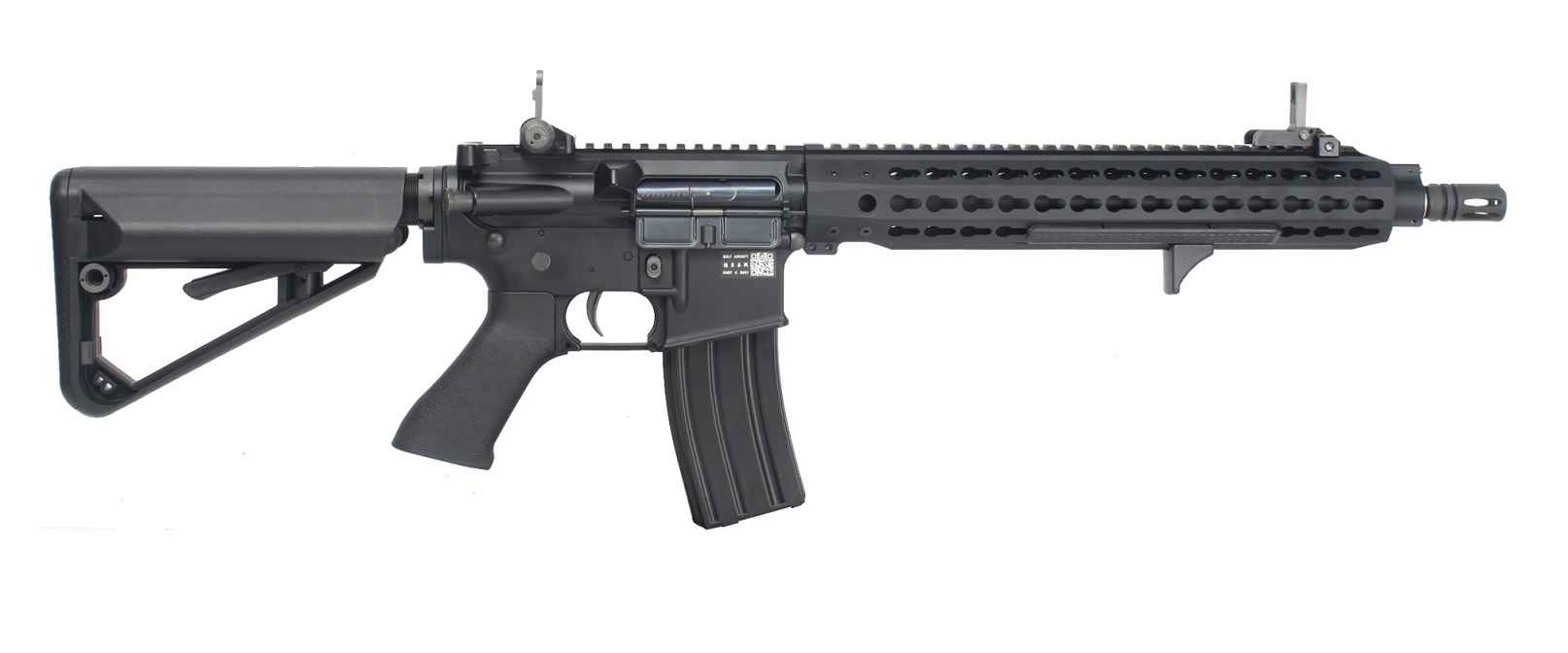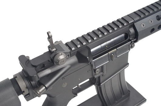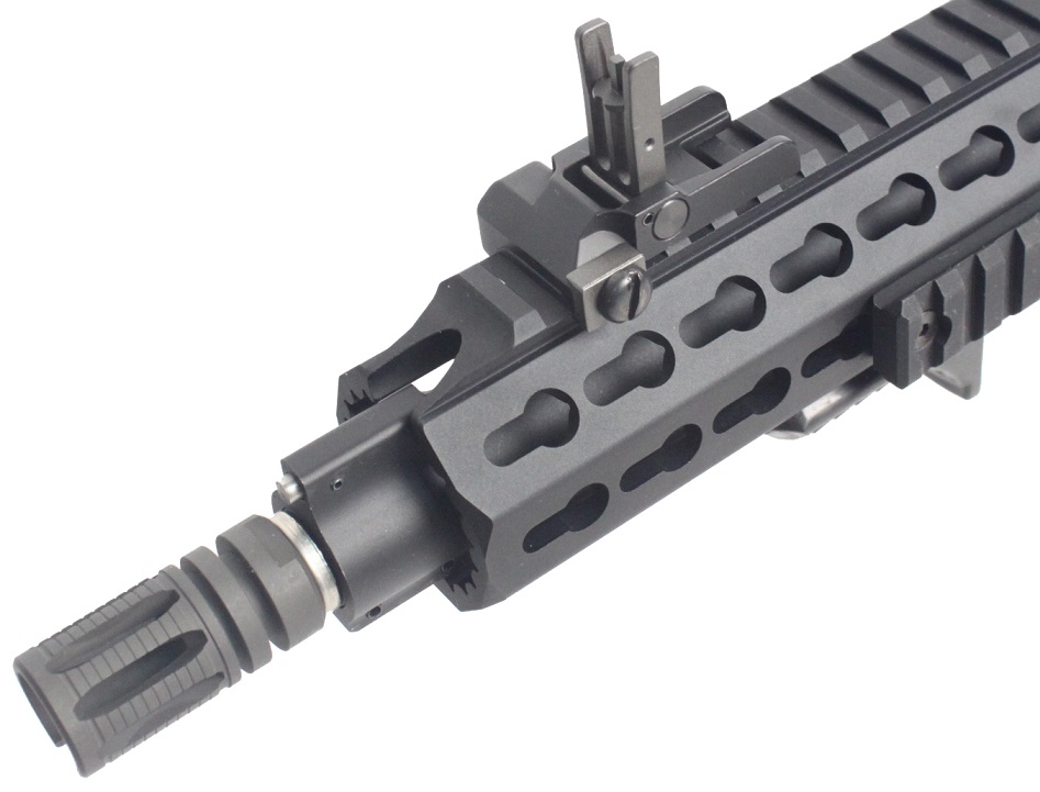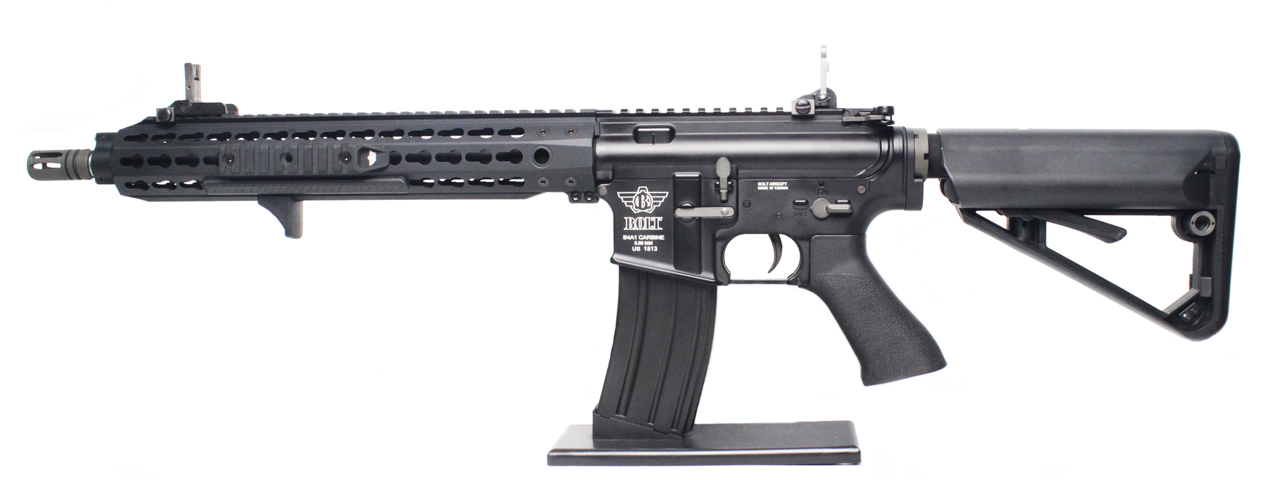 The BOLT Keymod RIS rail system offers a superior rail system for mounting any and all accessories an operator may need: Lights, lasers, grips, pressure switches, PEQ boxes, cameras, and more. The KEYMOD advantage allows the rail system to be entirely modular, letting the operator place keymod rails of various lengths where (and only where) they need them, allowing this rail system to hold accessories while maintaining it’s sleek profile. It also has the ability to mount accessories at 45 degree angles; a common limitation among standard 4-sided rail systems. With integrated QD sling mounts as well as removable and relocatable keymod rails and handstop, this rail is extremely functional, comfortable, and lightweight. Whether you run is loaded with mission-critical accessories or completely slick, the Keymod rail system is designed to be the ultimate, flexible rail system. Mounted atop the monolithic upper picatinny/weaver rail are a set of tip-up SCAR-style iron sights that can be easily detached or used in conjunction with other aftermarket optics such as red dots, holographics, or scopes.