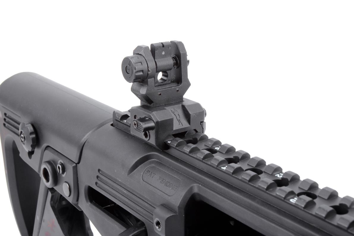 The CAA Airsoft RONI for P226 Conversion is ergonomic designed and equipped with ambidextrous front and rear sling mounts, and a large charging handle. Charging the weapon is easy and it is very user friendly to both left and right handed operators. It is integrated with a CNC machined Aluminum top and two side rails for mounting accessories, and a Nylon Fiber lower rail to mount any forearm grip. The RONI is equipped with an adjustable 5 positions buttstock, and features a spare magazine holder for faster reloading. The adjustable cheek rest on the buttstock is removable. The CAA RONI for P226 Conversion includes a pair of flip-up sights, a detachable folding forearm grip and a charging handle.