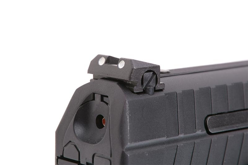 Thanks to the implementation of an anti-slip texture of grip, a profiled trigger guard and milling on the slide, the usage of the replica is incredibly comfortable even when wearing winter gloves. The equipping of the pistol with a rail compatible with RIS standard allows for the attachment of a tactical flashlight or a laser sight. The implemented in the pistol’s construction double-sided magazine release button allows for a comfortable usage of the replica to both left- and right-handed Users. What’s interesting is that the replica uses an operational Decocker meaning that there is an internal hammer release. The replica comes with a 13 BB magazine.