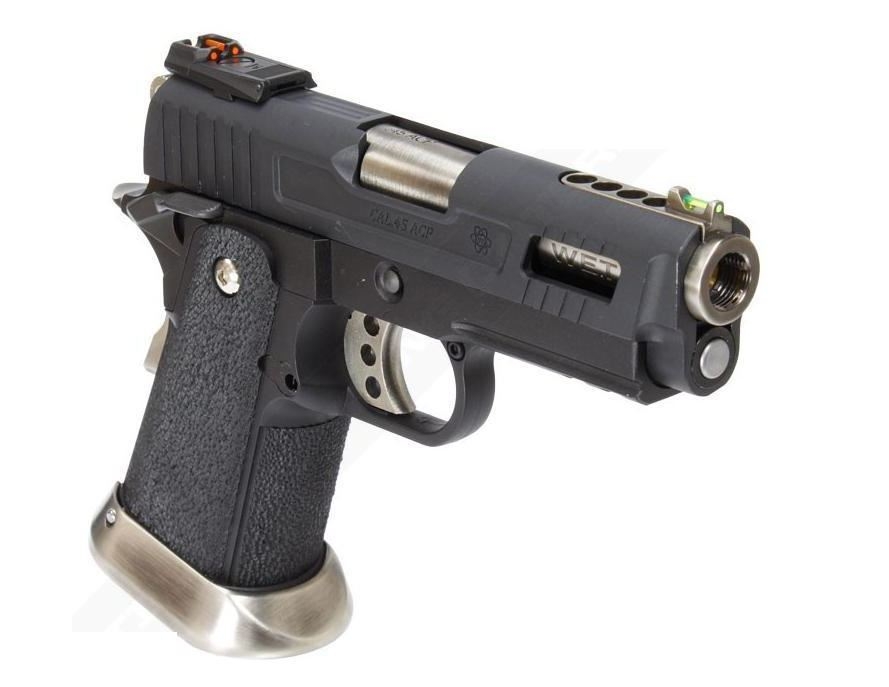 The pistol is constructed from Alloy with a Polymer Frame, and features a Flared Magazine Well and Mock Light Enhancing Sights. The weapon features a custom slide featuring a windowed slide, revealing the custom barrel inside. The barrel features the ‘WET’ branding and the pistol grip itself is stippled to give you extra grip on the pistol even when using gloves. The rear sight of the pistol is removable, and can be replaced with the included mount for Micro Red Dot, making the pistol a viable primary in CQB situations. The barrel for the Pistol is even threaded so that Suppressors can be attached. This pistol is perfect for those Airsoft Skirmisher who love modern load-outs, or for those who want to start getting into practical pistol shooting.