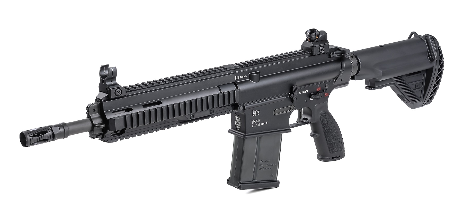 The 417 is the 7.62 caliber version of the H&K 416 which and is typically designed for DMR roles. The most obvious differences between the 417 and the 416 are the magazine and lower receiver. The magazine of the 417 is much larger then the standard 416 due to the increased caliber size of the real steel rifle, and the stock tube has also been increased in size.