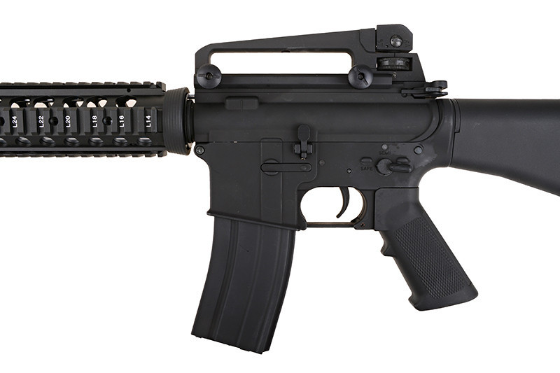 The application of the classic full stock in the replica allows to use a high capacity battery. There is a removable carrying handle located on the top of the replica, it facilitates the transport of the replica. In that place you can easily mount a red-dot sight or a scope.
