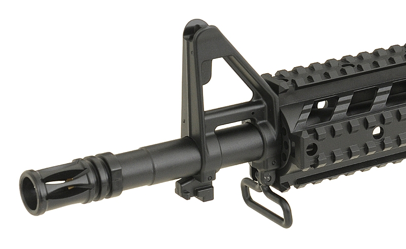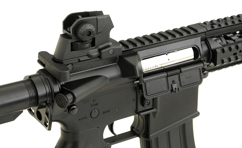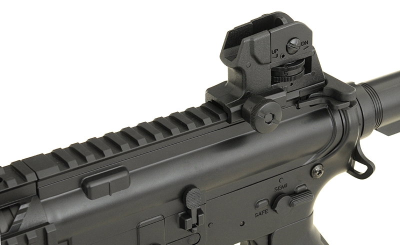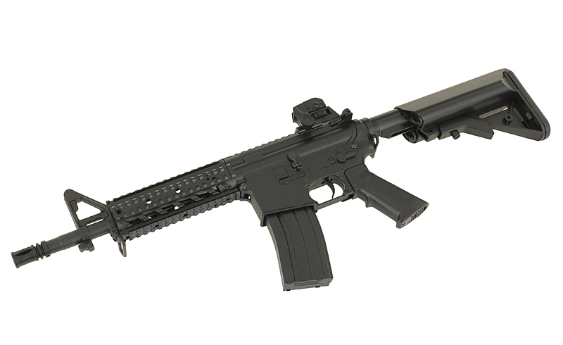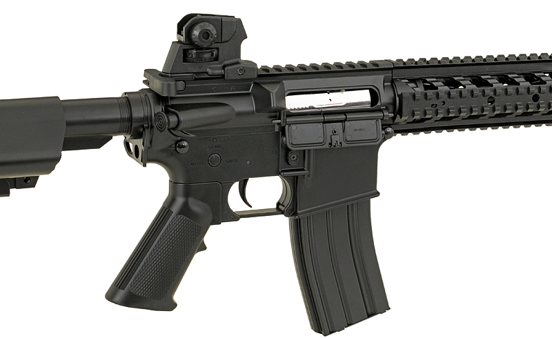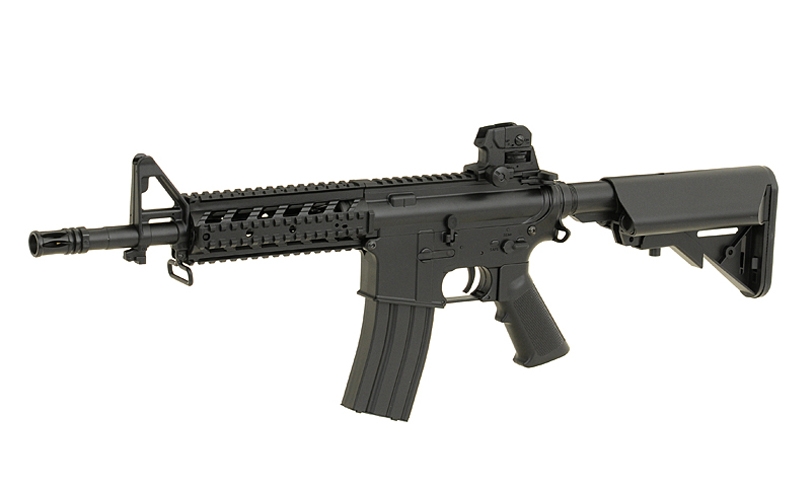 M4 Combat Machine is an Electric Airsoft 6mm BB Gun, commonly known as an AEG, which is built and designed to replicate the M4A1, used by Armed Forces around the World, and is a replica of one of the most recognisable Weapons Platforms in use today. The gun is constructed with a Polymer Receiver, Stock, Buffer Tube, Handguard and Sights, with an Alloy Barrel and Internals. This Airsoft Gun is Rear Wired, allowing the use of a wider range of Batteries, such as Crane Stock Batteries or Li-Po which fit down the buffer tube. The stock of the weapon features a Six Point adjustment system, allowing you to adjust the weapon between 70cm – 80cm, for a more comfortable shoulder weld. The Butt Plate of the Stock is made from Rubber, providing a slip free surface when using the weapon. The rifle comes with a Four Point 20mm RIS / RAS Handguard allowing the attachment of various Grips, Torches, Lasers and Sights, as well as a full Length top 20mm Rail for attaching large Scopes. The weapon comes with integrated Iron sights, which can be adjusted for Windage / Elevation, with the rear sight being hand removable with no tools required. The weapon comes with everything you need in the Box, coming supplied with a Battery, Charger and Magazine, allowing you to use the weapon right out of the box. This is the perfect Starter weapon for anyone new to Airsoft Skirmishing, providing a cheap and easy way to start playing.