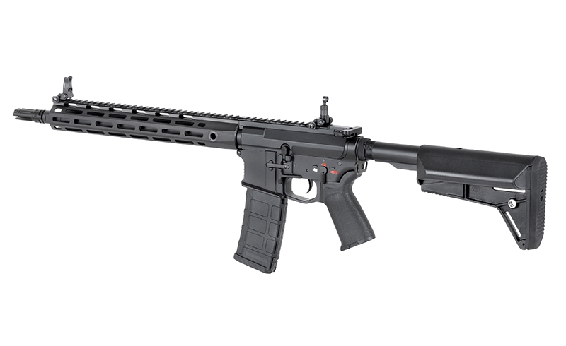 The rifle in the new E-EDITION & HIGH-SPEED configuration has a velocity of around 360 fps and, in combination with a LiPo battery, a ROF around 25rps and a faster trigger response. This was achieved due to the new gearbox parts with increased durability, such as: