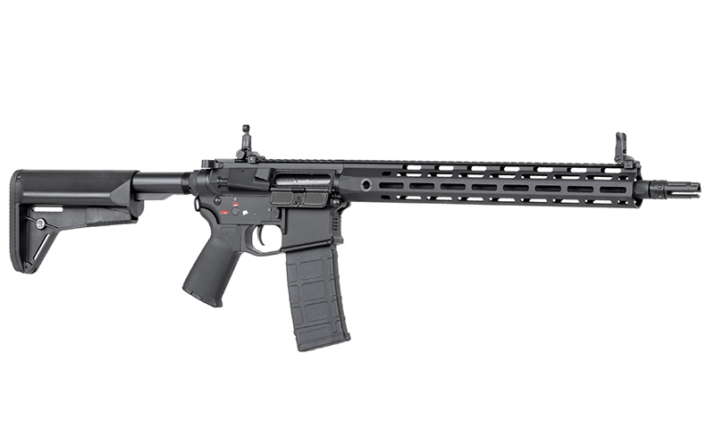 The rifle in the new E-EDITION & HIGH-SPEED configuration has a velocity of around 360 fps and, in combination with a LiPo battery, a ROF around 25rps and a faster trigger response. This was achieved due to the new gearbox parts with increased durability, such as: