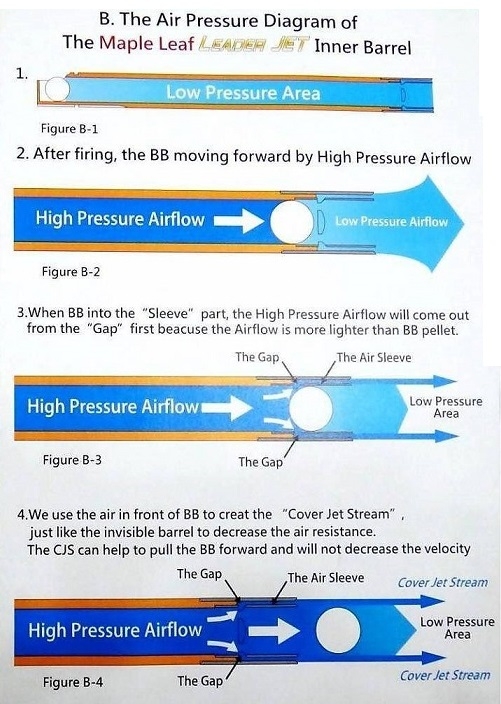 Maple Leaf designed a barrel where the end is wider compared to the rest of the barrel. At the end of the barrel the air will pass the BB and come out first and when the BB comes out of the barrel, the air stream pulls the BB in a so called jet stream. This will have less resistance on the BB and will NOT decrease the velocity but increases Accuracy instead !