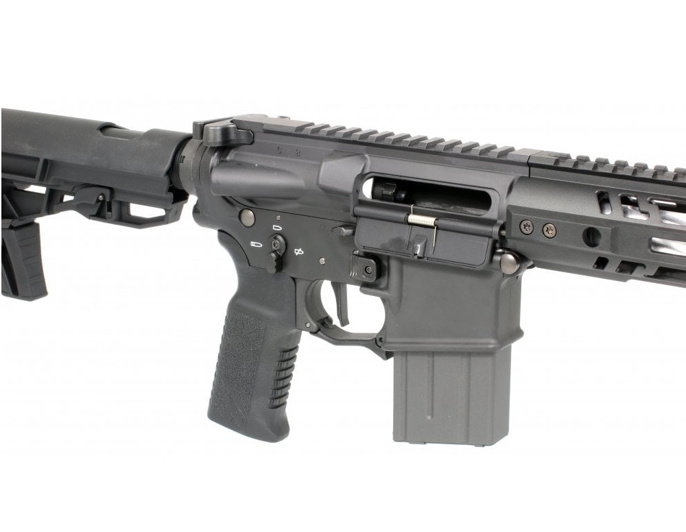 Operability according to preference and situation: Various control levers, including charging handles, are ambi specifications that can be accessed from either the left or the right, and reliable operation is possible even with gloved hands due to large size. By inverting the extension at the lower end of the rear end of the stock, you can select a concave type that closely adheres to the body and a convex (convex) type that makes it easy to move the muzzle up and down, and accommodates expansion and contraction adjustment of 6 stages. The grip adopts a vertical design (vertical) easy to grasp even if the stock is shortened.