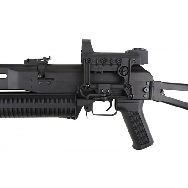 Replica of PP-19 submachine gun manufactured by Cyma. Its archetype was a Russian machine gun designed in the early 90s on the basis of the popular AK rifle. Powered 9mm ammunition (7.62mm variant also existed: Bizon-2) submachine gun with compact dimensions was dedicated to the use of special forces and police units. Replica is mostly is made of steel. Thus makes a solid impression, everything is also very well matched. The steel elements are: the entire body with the cover of the receiver, stock with locki, front grip and fastening pins. Other metal parts, such as dummy lock, front sight base or flash suppressor, were made from ZnAl. Pistol grip and magazine are made of reinforced plastic. Stick type battery is located under the cover of the receiver – just like in AK-type replicas. The battery is included, so everything you need can be found in the box. The replica has a skeleton stock folding to the left. Also, there’s “dovetail” side rail mount to attach dedicated optical sights or additional RIS rails. The outer barrel wnds with 14mm left-handed thread for supressor installation. The heart of the replica is reliable gearbox v.3, which guarantees easy access to spare parts and tuning. Inside you will find a set of reinforced parts, including beared spring head and piston head, a set of steel gears and steel 7mm bearings. Whole set is driven by a high torque motor. Thanks to its compact dimensions and good balance, PP-19 Bizon works excellently during airsoft operations on medium and short distance, also in the CQB. Replica comes with PBS-1 silencer and “Cobra” optical sight replicas. The collimator is powered by two AA batteries (not included) and have 4 different types of dots and the ability to adjust the brightness and position of the sighting. Characteristic tubular magazine is made from plastic, it’s mid-cap with a capacity of 200 BB’s