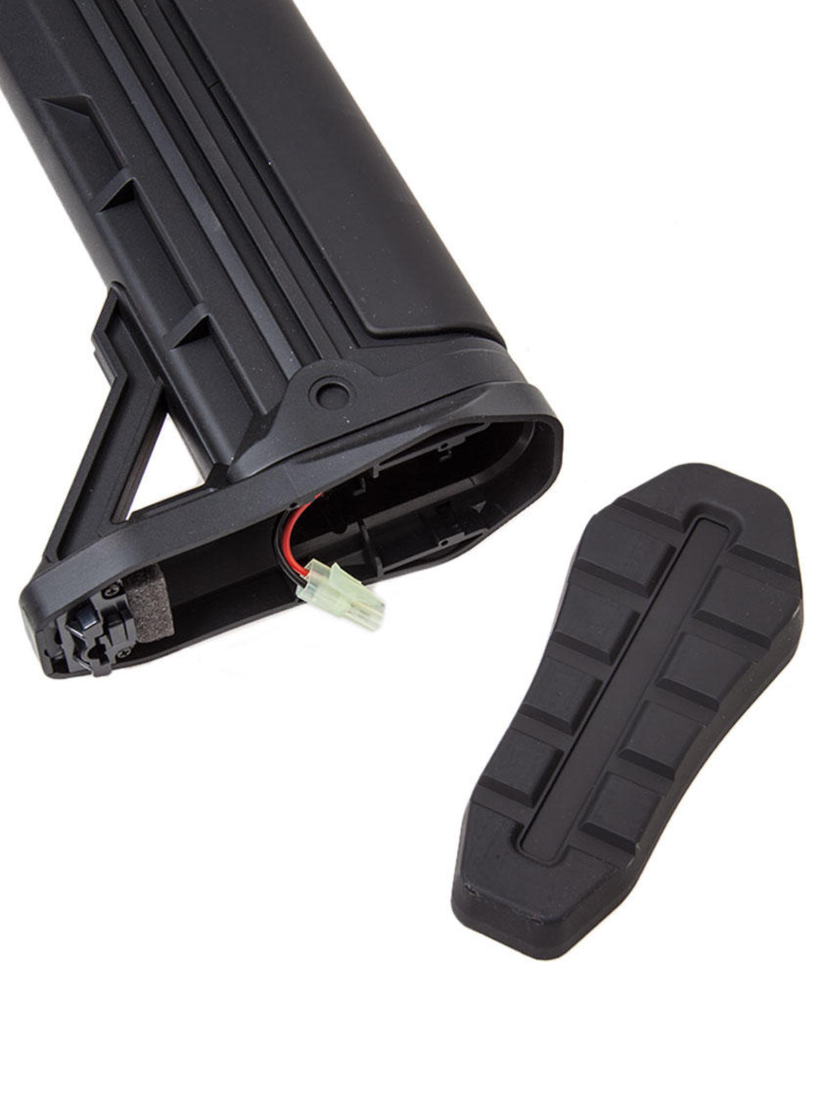 Polymer fixed stock with padded rubber cheek rest, butt pad and Metal sling plate