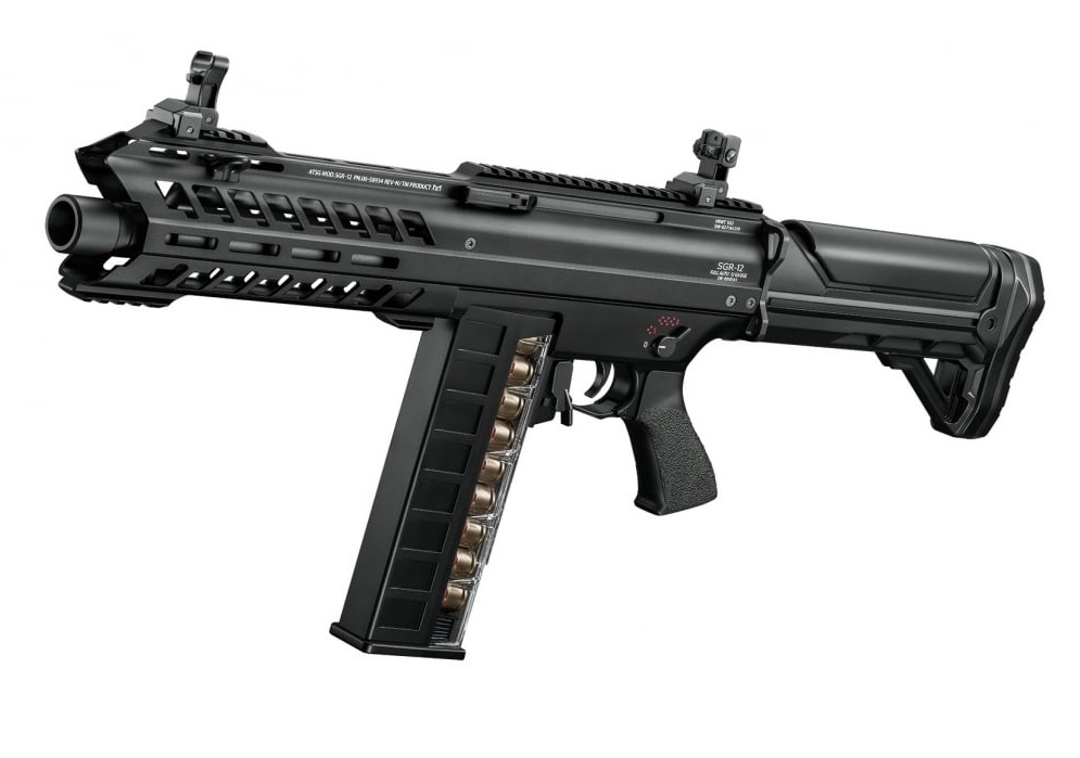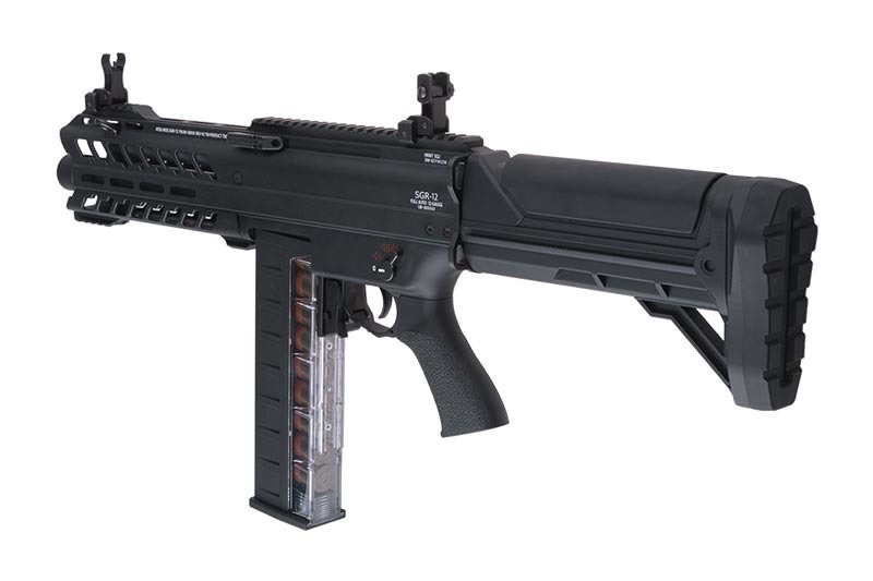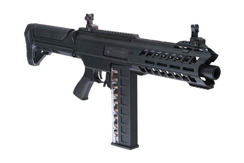 Includes 96 rounds mid-cap box magazine with visible dummy 12 gauge shells
