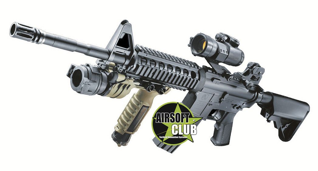 Employing the new SHOOT & RECOIL Engine Version 2, this new M4 is a blast to shoot with both sound and visual gratification to boot. The gun comes with a standard Tokyo Marui 82 round magazine but it can be set to work in 30rd mode for realism and to force reloads. The gun is of full aluminum (i.e. Full metal) construction with ABS stocks and grips for more realistic feel!