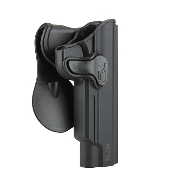 Amomax holster is compatible with 4 different carrying platforms –paddle (standard), belt clip, MOLLE, and drop leg platform.