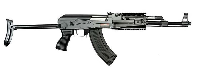 AK47S, known as AKS47, which is the early development of the AK47 Assault rifle. It equipped with an underfolding metal shoulder stock which similar to that of the German MP40, for use in the restricted space in the BMP infantry combat vehicle, as well as by paratroopers.