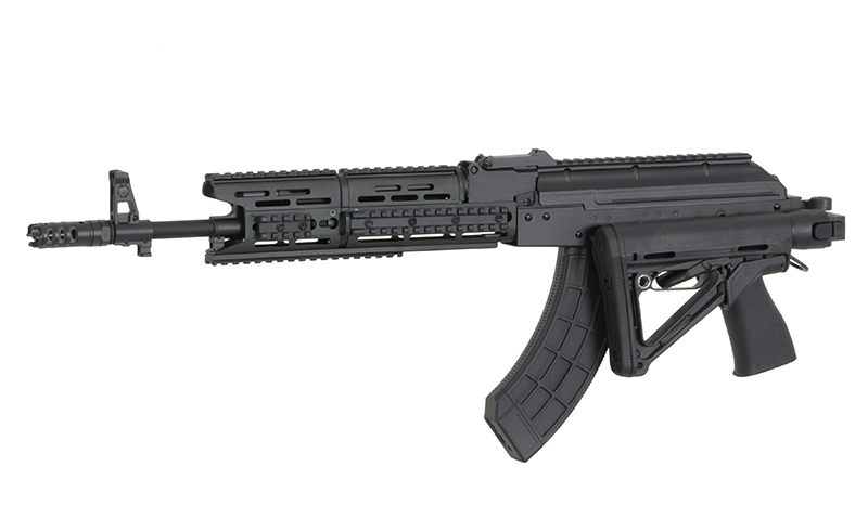 Replica of the new series of AK assault rifles. These rifles are produced in many specifications that include civil or military. Receiver, receiver cover, external barrel, safety lever, rear sight base, trigger, gas port block, gas cylinder, bolt carrier, front sight base and muzzle brake are made of steel and aluminum, that made the replica is more realistic.