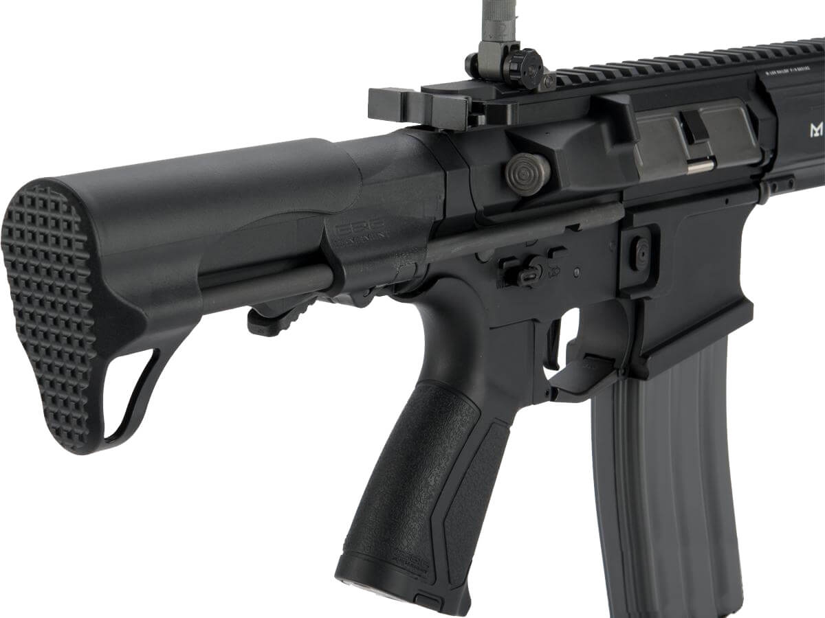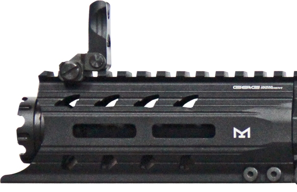 Toward the rear you will notice that G&G has installed a retractable PDW style stock that can fit a 11.1v LiPo battery. On the front rests a 5″ Milspec M-lok rail with areas to attach rail segments to install the accessories needed to optimize your airsoft gun to its maximum potential. Across the top section is a monolithic standard rail system that provides plenty of space for an optic and the included flip up sights.