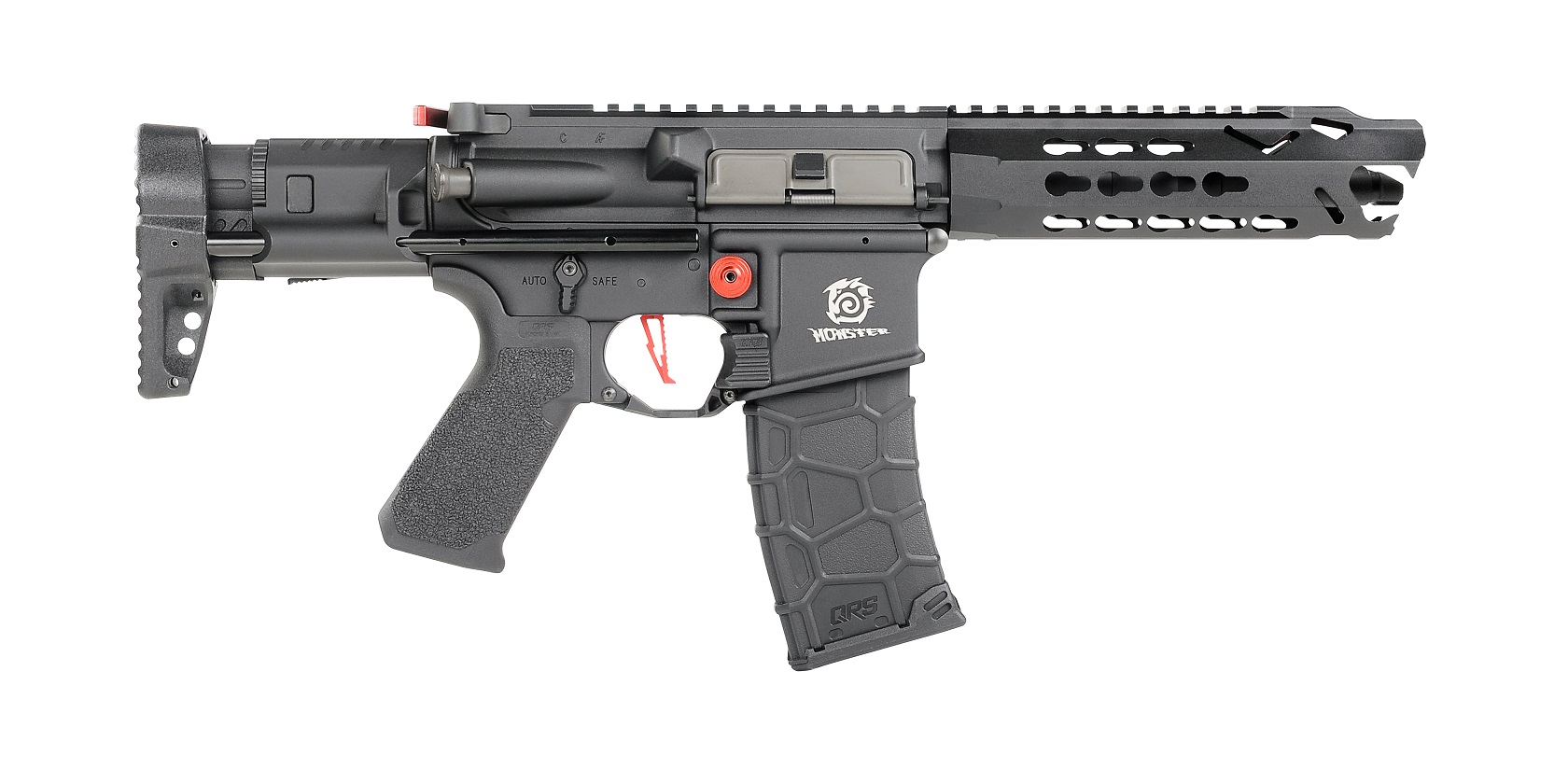 The replica’s construction is, of course, full metal (aluminum alloy), with an addition of steel elements such as the flash hider, shell ejection window flap, stock slide ring or manipulators. The receiver bears effective Avalon Weapons Works markings along with Monster series logo. Parts made from reinforced polymer include the QRS pistol grip with anti-slip, rough texture, trigger guard and adjustable, telescopic stock.