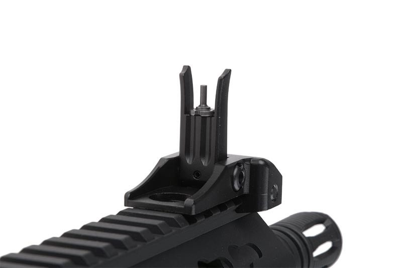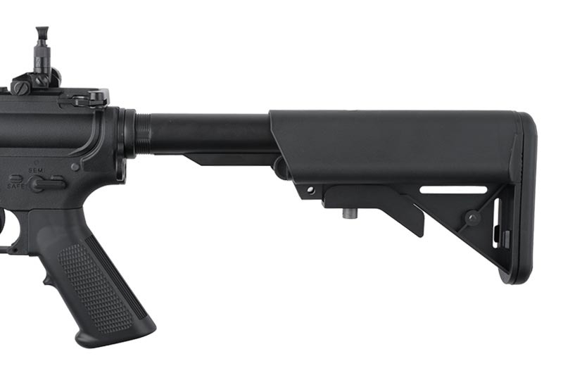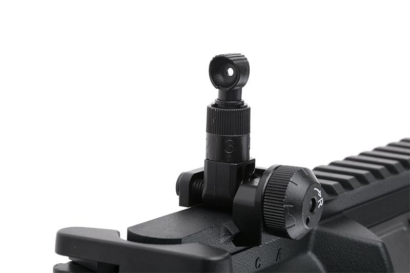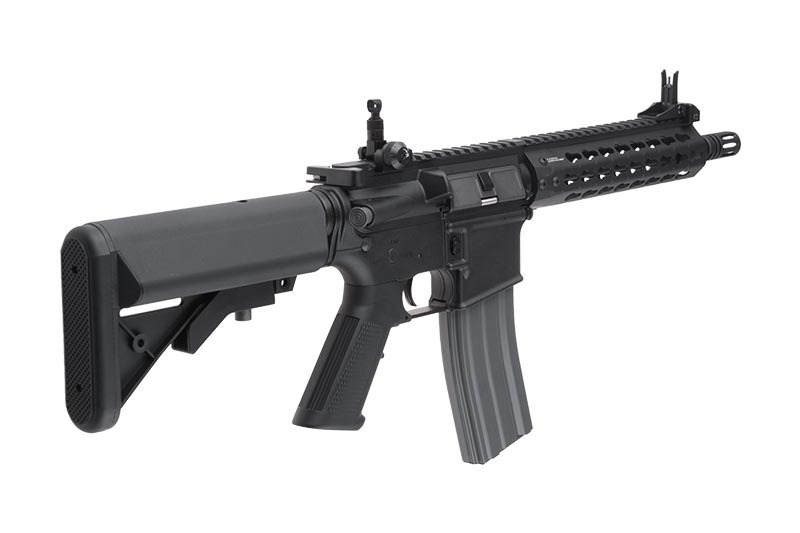 The replica features an SF stock with a rubber stock pad. Inside the stock is room for a battery. The stock is adjustable, which allows for the customization of the replica’s length to the body type and preferences of the User. The replica features a RIS 22 mm rail on top and a KeyMod handguard. The replica also features a gearbox V2 based on 8 mm bearings, which allows for achieving a muzzle velocity of 350 FPS. This and the implementation of a 260 mm long outer barrel make this replica ideal for middle-ranged activities. Inside is a sealed pneumatic system, equipped with a high-quality chamber and HU bucking.