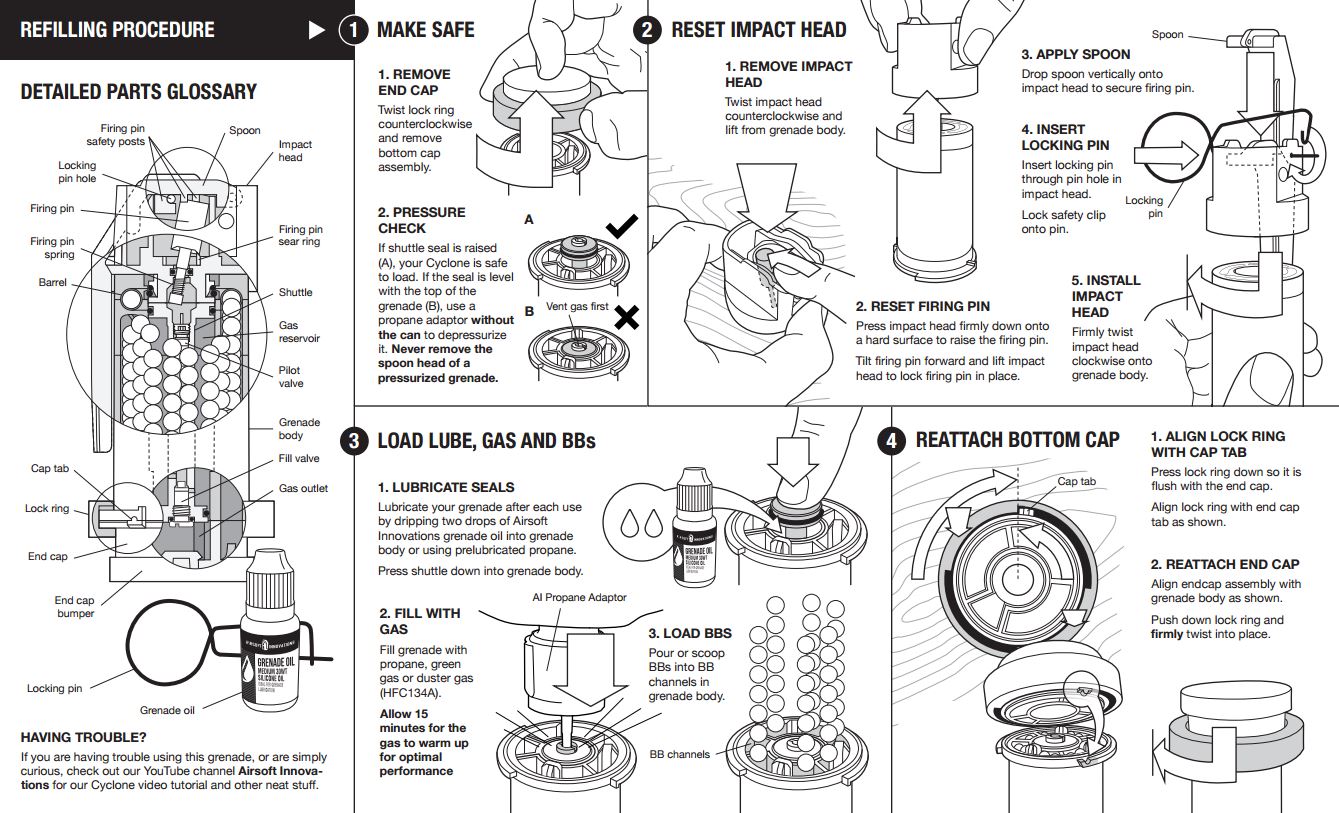 Just make safe, reset the fuse head, dump BBs straight into the body, add your propellant of choice (propane aka green gas or HFC134A aka duster), close the body and your Cyclone is back in action. The whole process can be done in 40 seconds, much faster than the Tornado.