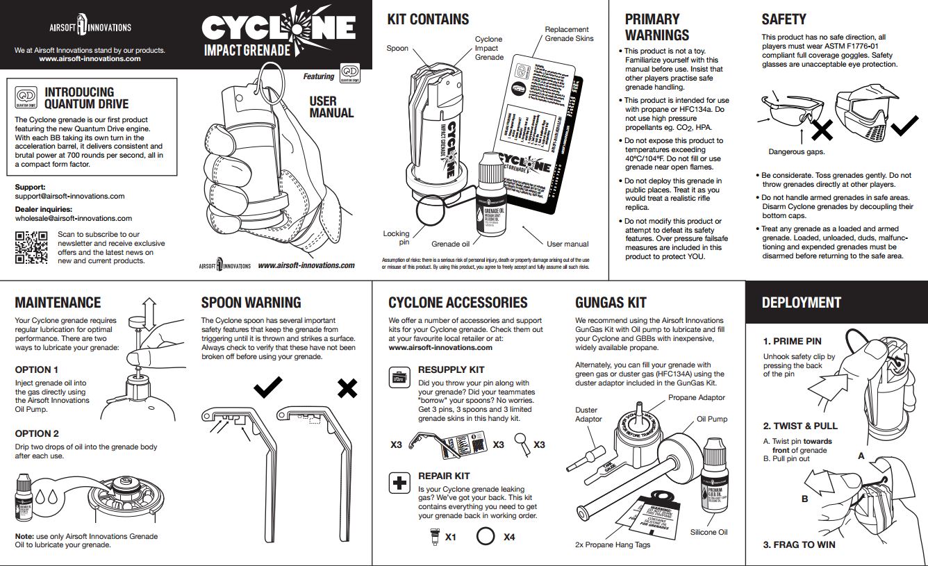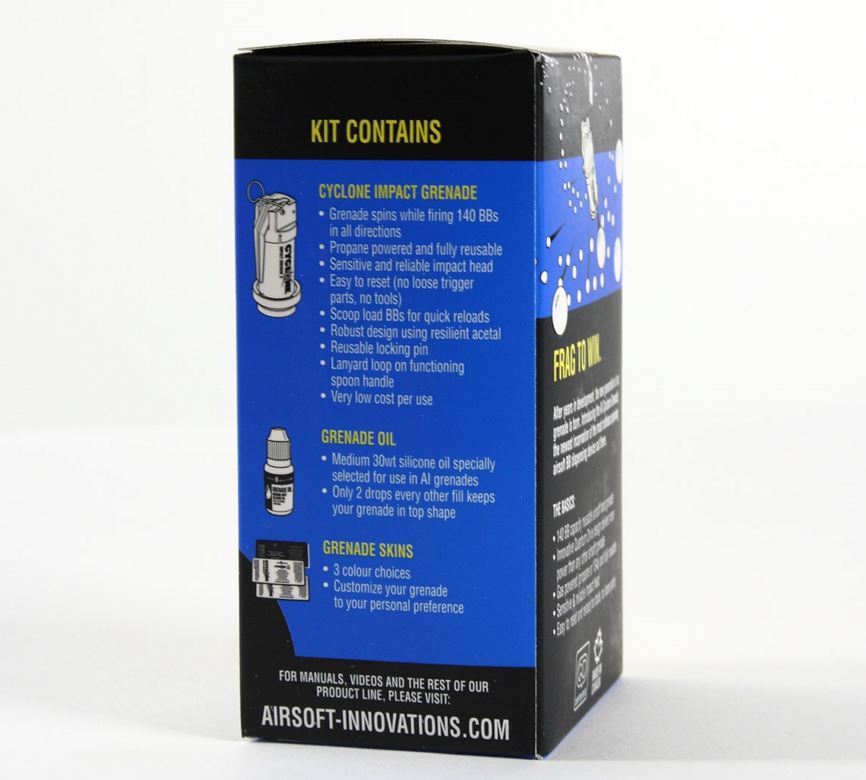 After years in development, we are thrilled to introduce the Airsoft Innovations Cyclone Impact Grenade; the newest incarnation of the most ruthless spinning airsoft BB dispensing device out there. Using our new Quantum Drive engine, it unleashes a spinning storm of 140 BBs at 225 feet per second