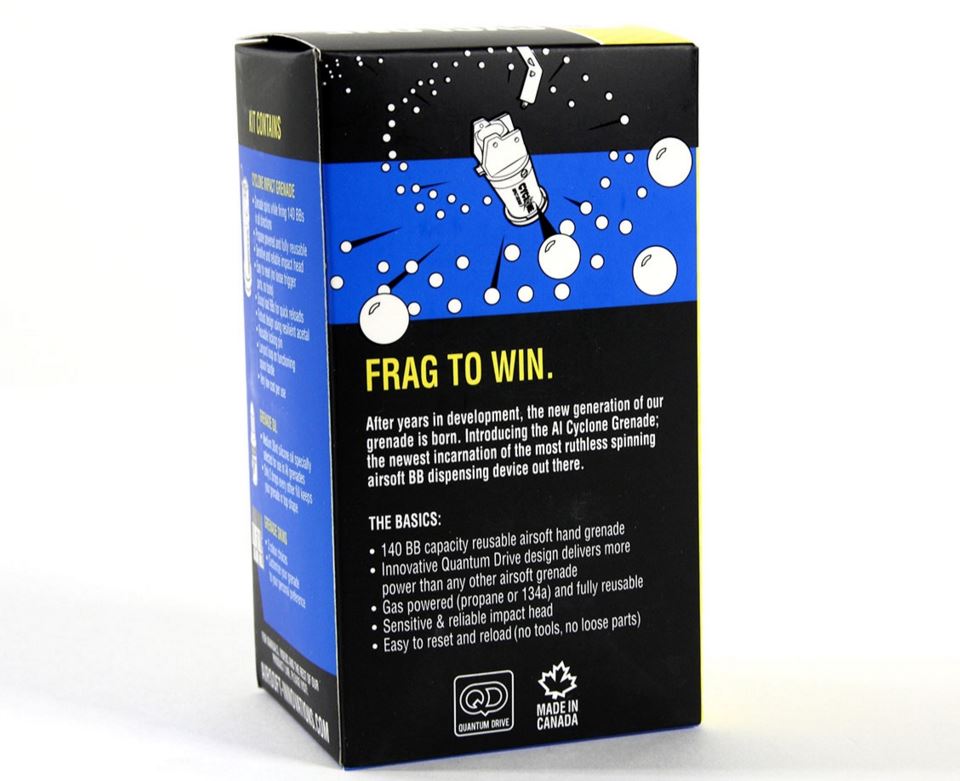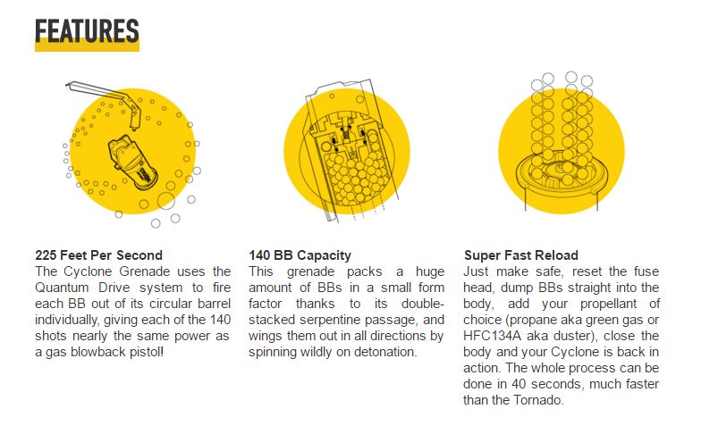 The Cyclone Grenade uses the Quantum Drive system to fire each BB out of its circular barrel individually, giving each of the 140 shots nearly the same power as a gas blowback pistol!