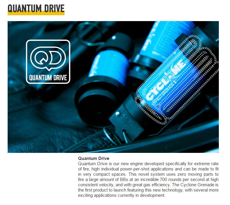 Quantum Drive is our new engine developed specifically for extreme rate of fire, high individual power-per-shot applications and can be made to fit in very compact spaces. This novel system uses zero moving parts to fire a large amount of BBs at an incredible 700 rounds per second at high consistent velocity, and with great gas efficiency. The Cyclone Grenade is the first product to launch featuring this new technology, with several more exciting applications currently in development.