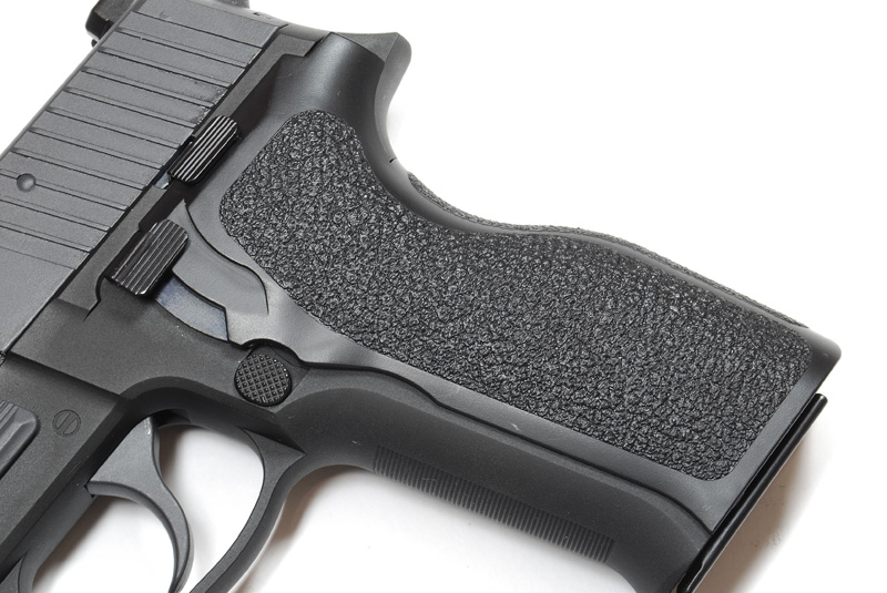 Introduced at the 2010 SHOT Show, the P226 E2 at the time was a significant update to the P226 line. ‘E2’ (pronounced ‘E-squared’), or otherwise known as “Enhanced Ergonomics”, is SIG Sauer’s attempt to make the large frame gun more ergonomic for persons with small and medium sized hands. A reduced grip size and reduced reach trigger bring the trigger face back more than 13 mm (0.5 in), thus potentially allowing better trigger manipulation and control for a greater number of shooters. Other standard features include the Short Reset Trigger, aggressive grip finish texture, and a new wrap-around, one-piece grip panel configuration. The gun was discontinued from the P226 model lineup at the end of 2010 but the E2-style grip system has been adopted on and carried over to other P226 variants.