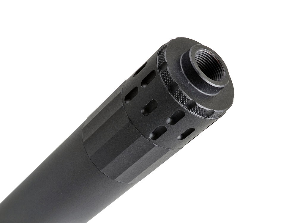Licensed from Gemtech, Madbull has created an identical GM-9 suppressor for Airsoft pistol; though it also looks sick attached to an AEG. This barrel extension has a highly durable T6-6061 aluminum construction with the black matte finished and Gemtech unique logo on front tip. This barrel extension brings a unique look to your airsoft pistol or rifle build. This barrel extension not only looks amazing on your pistol but can definitely increase the sex appeal of AEG’s with it’s thinner cylindrical build opposed to its thicker 45mm counterpart.