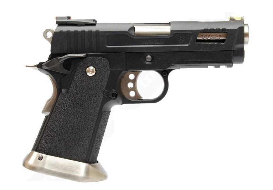 The pistol is constructed from Alloy with a Polymer Frame, and features a Flared Magazine Well and Mock Light Enhancing Sights. The weapon features a custom slide featuring a windowed slide, revealing the custom barrel inside. The barrel features the ‘WET’ branding and the pistol grip itself is stippled to give you extra grip on the pistol even when using gloves. The rear sight of the pistol is removable, and can be replaced with the included mount for Micro Red Dot, making the pistol a viable primary in CQB situations. The barrel for the Pistol is even threaded so that Suppressors can be attached. This pistol is perfect for those Airsoft Skirmisher who love modern load-outs, or for those who want to start getting into practical pistol shooting.