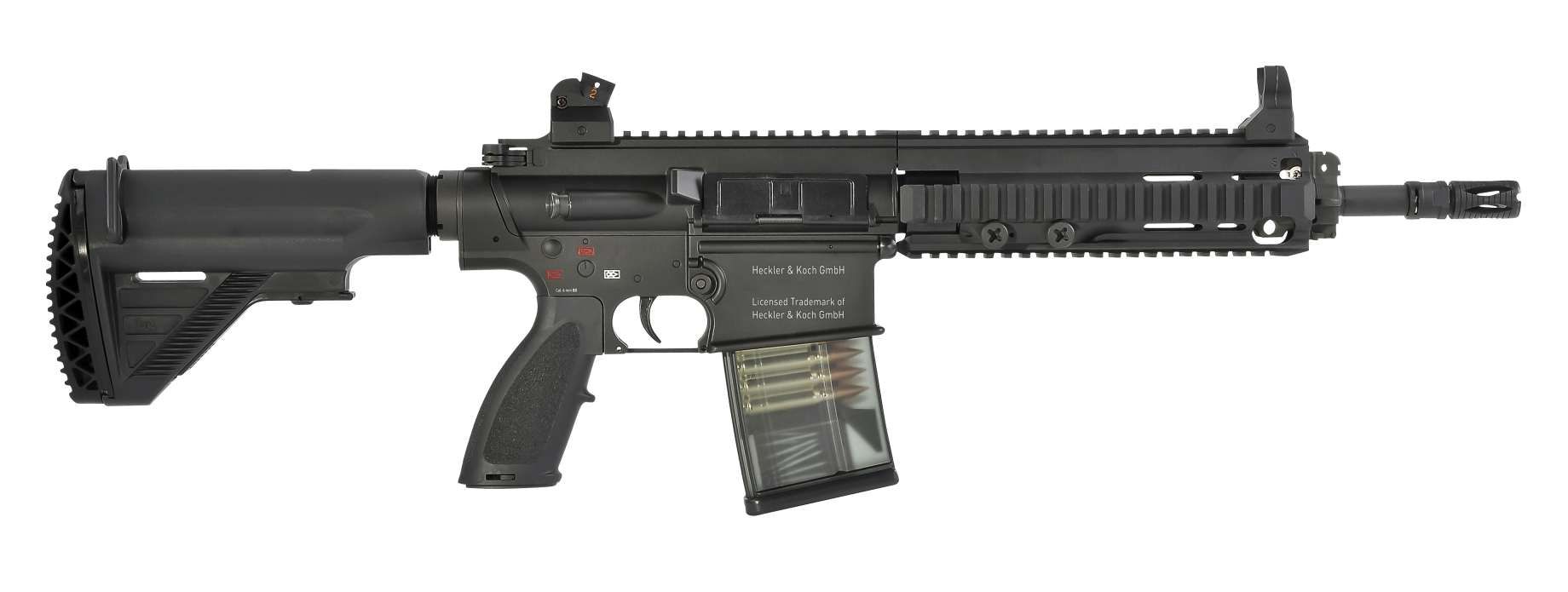 The 417 is the 7.62 caliber version of the H&K 416 which and is typically designed for DMR roles. The most obvious differences between the 417 and the 416 are the magazine and lower receiver. The magazine of the 417 is much larger then the standard 416 due to the increased caliber size of the real steel rifle, and the stock tube has also been increased in size.