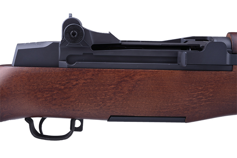 Access to Hop-Up is gained after the bolt is pulled back. The trigger safety is located in the metal trigger guard, which enables rapid securing of the replica from accidental firing. In addition, the replica features a fully adjustable sight, also made from metal. Iron sights comprise of an open, clear front sight and a rear sight. M1 replica has a metal bolt, which sound of reloading will be a pleasant surprise to every user.