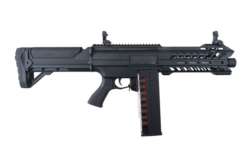 Utilizes Tokyo Marui style 30 round Airsoft shotgun shells