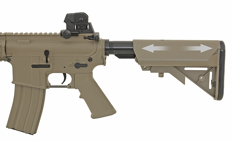 M4 Combat Machine is an Electric Airsoft 6mm BB Gun, commonly known as an AEG, which is built and designed to replicate the M4A1, used by Armed Forces around the World, and is a replica of one of the most recognisable Weapons Platforms in use today. The gun is constructed with a Polymer Receiver, Stock, Buffer Tube, Handguard and Sights, with an Alloy Barrel and Internals. This Airsoft Gun is Rear Wired, allowing the use of a wider range of Batteries, such as Crane Stock Batteries or Li-Po which fit down the buffer tube. The stock of the weapon features a Six Point adjustment system, allowing you to adjust the weapon between 70cm – 80cm, for a more comfortable shoulder weld. The Butt Plate of the Stock is made from Rubber, providing a slip free surface when using the weapon. The rifle comes with a Four Point 20mm RIS / RAS Handguard allowing the attachment of various Grips, Torches, Lasers and Sights, as well as a full Length top 20mm Rail for attaching large Scopes. The weapon comes with integrated Iron sights, which can be adjusted for Windage / Elevation, with the rear sight being hand removable with no tools required. The weapon comes with everything you need in the Box, coming supplied with a Battery, Charger and Magazine, allowing you to use the weapon right out of the box. This is the perfect Starter weapon for anyone new to Airsoft Skirmishing, providing a cheap and easy way to start playing.