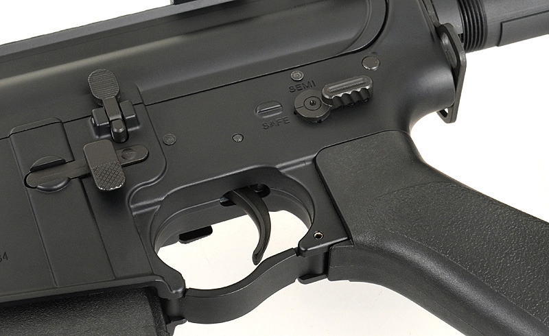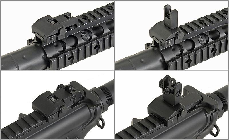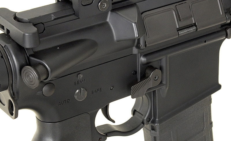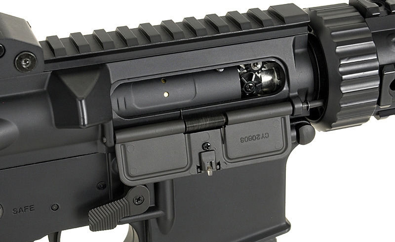 The weapon comes from the latest edition, which has a newly processed body with a functional ejection window, a draw bar and a metallic imitation of the breech. Other modifications for better handling, eg gloves, include a magnifying glass, a higher shot mode switch, and a double-sided cartridge dispenser with better-available buttons. The modern M4 is equipped with a tactical Emod sliding sleeve (6 setting positions), pistol grip HK416 and hinged sights, between which various optics or collimators can be attached. A double-sided steel tab between the body and the stock tube is used to attach the strap.