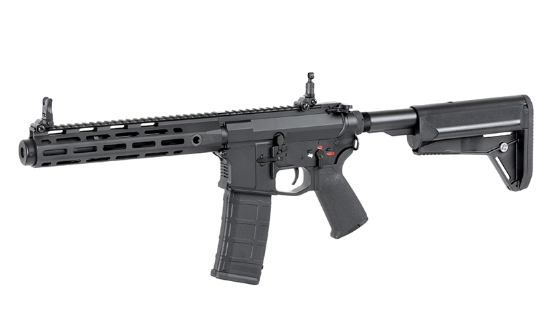 The rifle in the new E-EDITION & HIGH-SPEED configuration has a velocity of around 360 fps and, in combination with a LiPo battery, a ROF around 25rps and a faster trigger response. This was achieved due to the new gearbox parts with increased durability, such as: