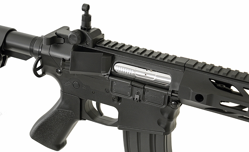 Functional Charging Handle which when pulled back reveals the Hop-Up Unit
