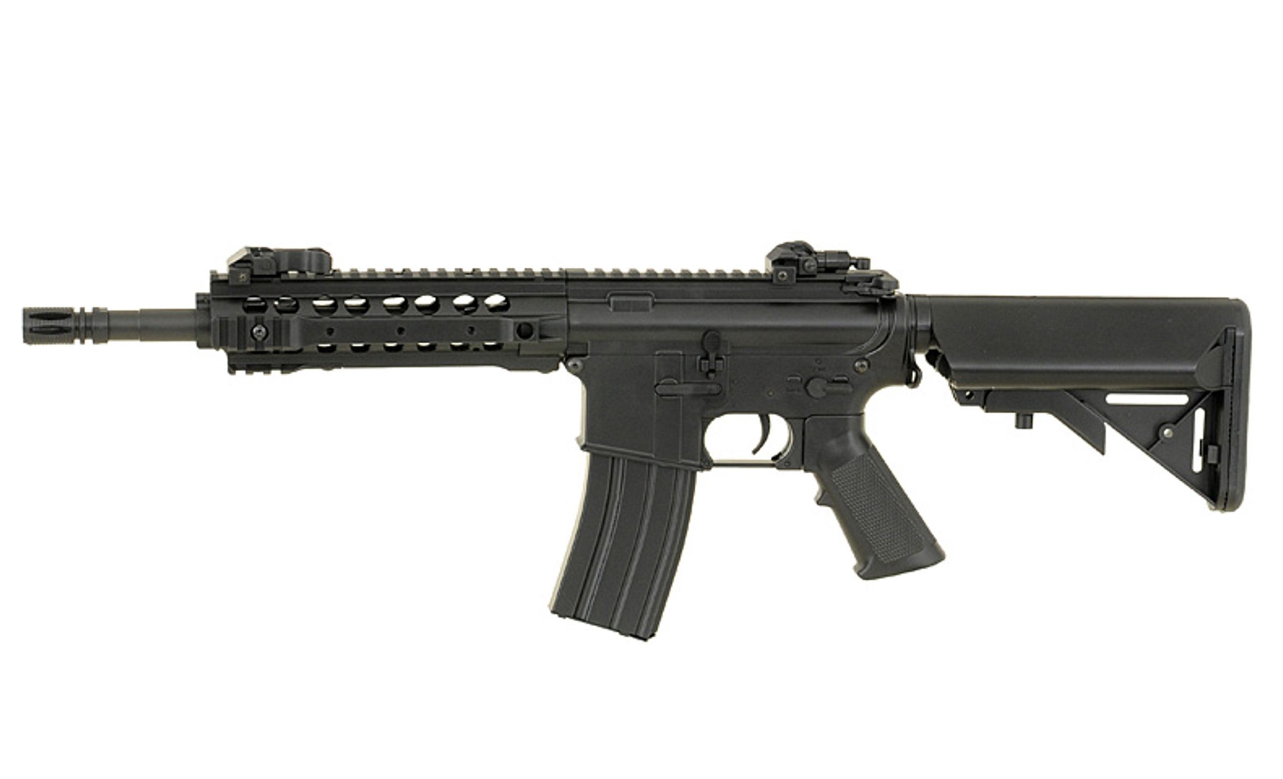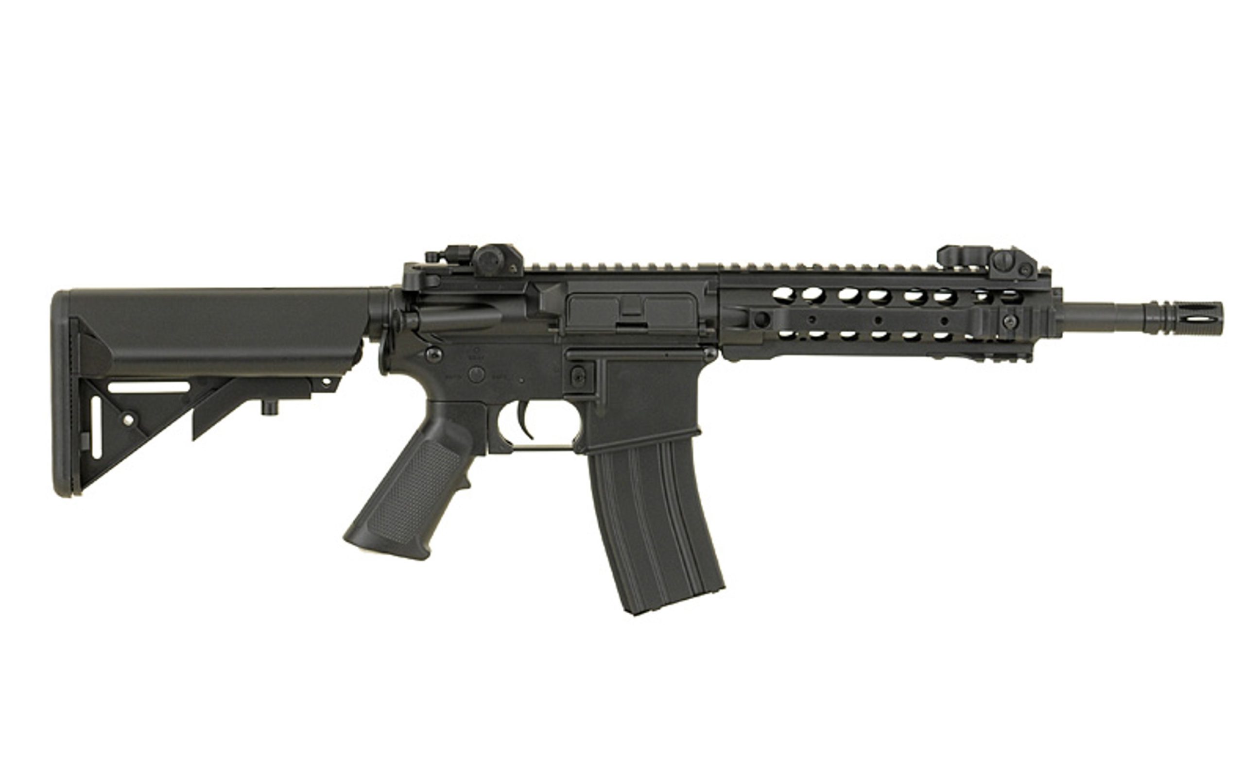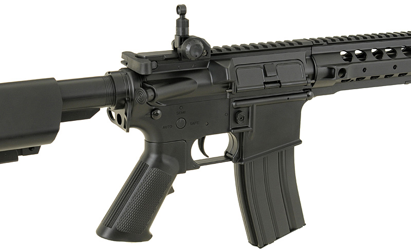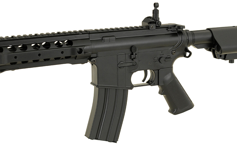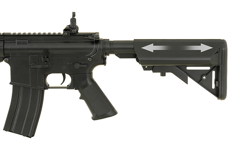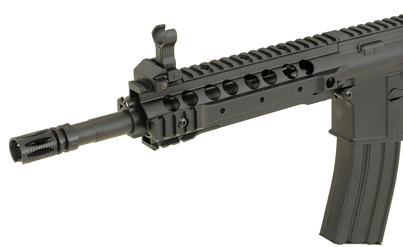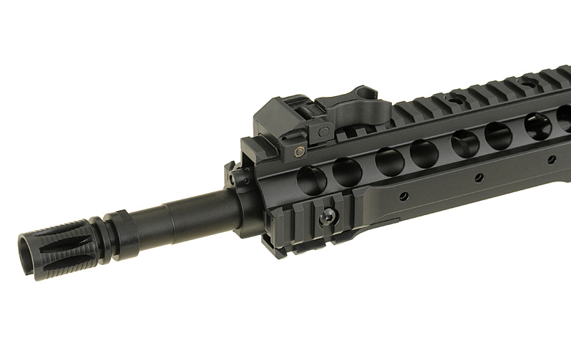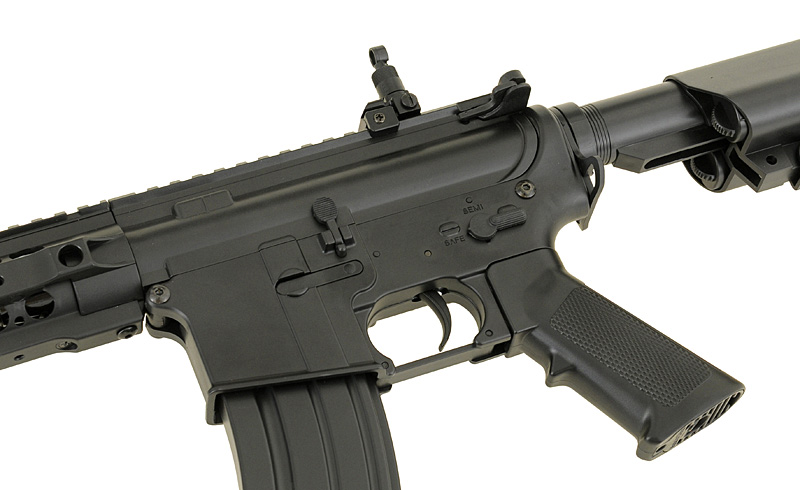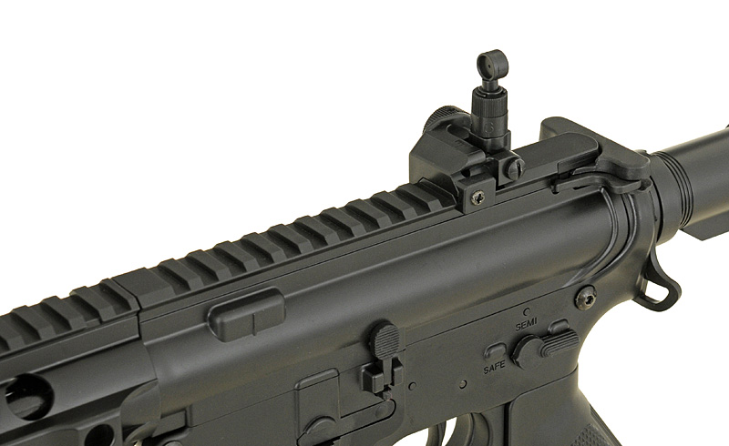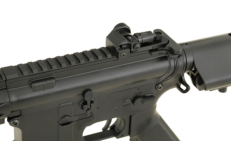 Replica of a new series of low-budget rifles one of the most popular Chinese manufacturers in the world – CYMA. The rifle offers the same things as the other products of that manufacturer (metal gearbox and other mechanical parts), but thanks to the use of high-quality plastic in place of elements made of metal (eg. body, handguard, front/rear sights, buffer tube, flash hider, magazine) allowed reduced the price. Now, every beginner will be able to afford to buy their favorite rifle and start the adventure with ASG with reliable replica for lower price.