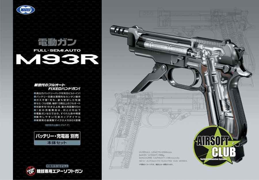 Micro Automatic Electric Gun from Tokyo Marui. The Tokyo Marui M93R AEP uses same gearbox mechanism and concept as the Tokyo Marui Glock 18C AEP. Marui M93R AEP has good muzzle velocity, rate of fire and accuracy. Plastic frame, full metal foregrip. Semi & full automatic.