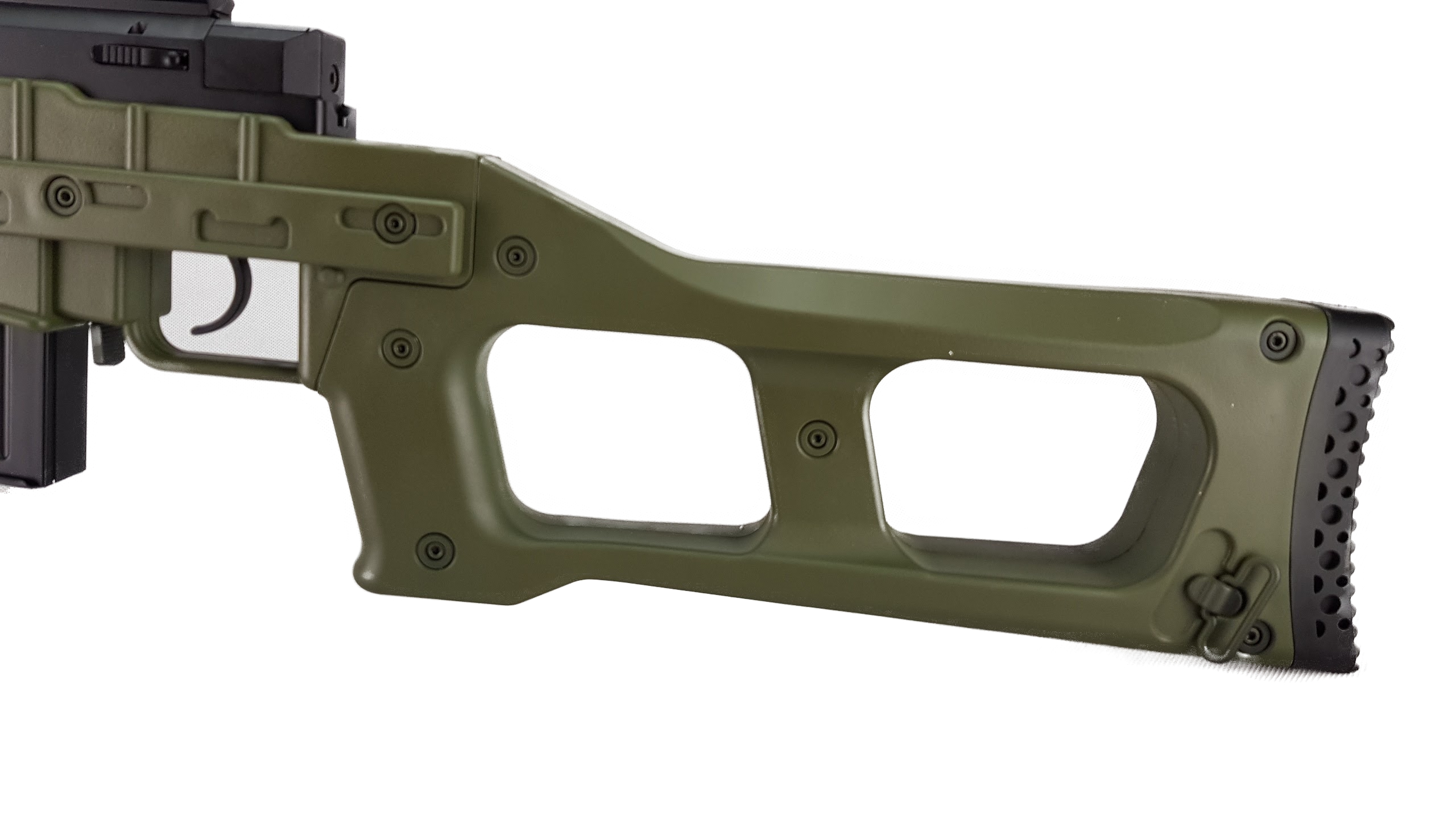 The new WELL air-cocking sniper rifle series borrows from both the TM L96 and their VSR-10 to make a new hybrid design incorporating the strengths of both systems. The rifle is constructed from a glass fiber reinforced polymer receiver with a full metal barrel and bolt assembly for enhanced durability. Its ergonomic design makes it very comfortable to use and shoot while its polymer receiver make it very light weight for transporting.