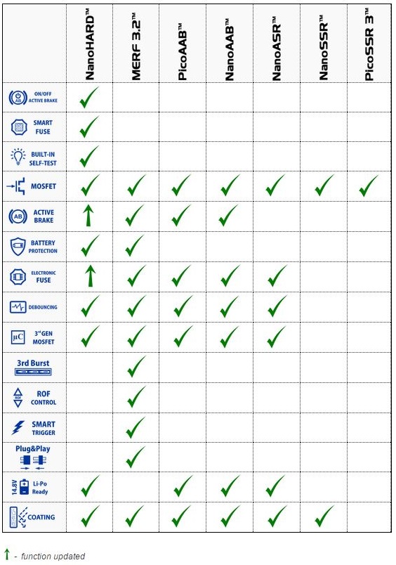 Multifunctional programmable 3rd generation MOSFET. The system has as much as 10 functions. Its latest feature is the 3-rd Burst Mode, which allows for limiting the number of shots. The system allows for lossless rate of fire adjustment; it protects state-of-the-art Li-Ion batteries: LiPoly and LiFePO4; it has a built-in active brake; and it protects contacts against damage. The Smart Trigger function enables achieving faster trigger response. Thanks to two operating modes, the system works with both the original and the modified AEG installation. The system is designed for all replicas and especially for the upgraded ones. It has been adapted to work even with the most powerful springs, including M170.