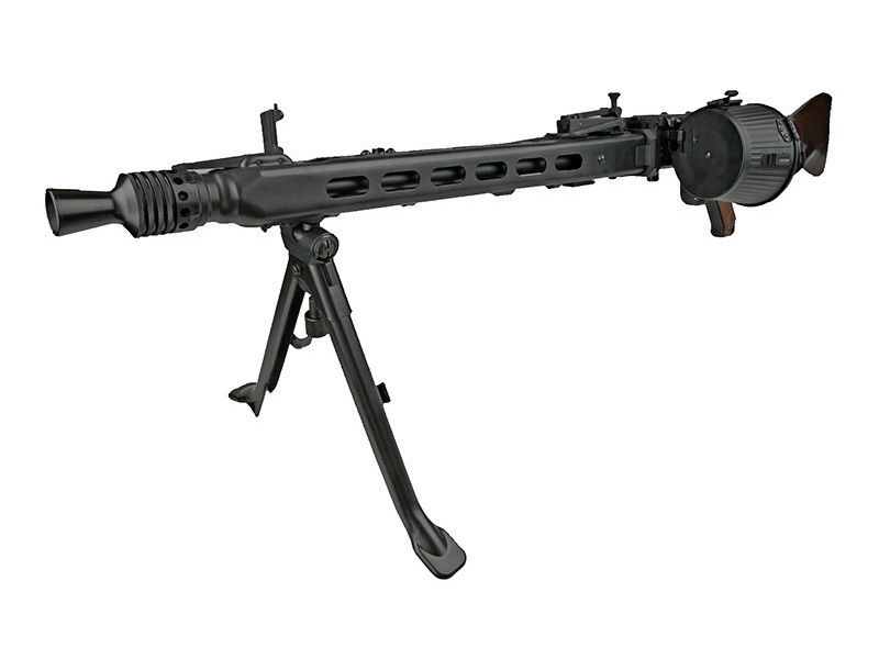 The most highly anticipated and authentic World War II replica is finally here! The NEW AGM MG 42 (Maschinengewehr 42) full metal airsoft AEG machine gun is truly a thing of beauty. Highly regarded for its durability and simplicity, the MG 42 has a proven record of reliability that has finally found its way into airsoft. This truly unique 16-pound, airsoft medium machine gun, based on the infamous weapon used by German Armed Forces during the Second World War, has so far proven to be a ruthless AEG when put to the test. From the receiver to the ventilated handguard, this rugged World War II replica features a hefty, full metal build. This includes the rugged, folding bipod, mock charging handle and flip-up iron sights. For added authenticity, this machine gun even comes with a real wood stock for storage of mini type or LiPo batteries. Similar in design to its real steel counterpart, this MG42 AEG can easily deliver a high volume of high velocity suppressive fire. This MG42 AEG, configured to fire in full auto only, shoots up to 420 FPS (w/ 0.20g BBs) with an impressive rate of fire (use higher voltage batteries to increase ROF). Thanks to an auto-winding drum mag, you have up to 2,500 rounds at your disposal to provide cover fire and light up your targets. While the MG42 machine gun by AGM is geared for actual airsoft applications, this replica is just as perfect for World War II reenactments.
