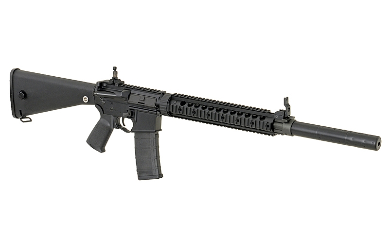 MK12 SPR Mod.1 Custom w/ Full Stock – Black is an Electric Powered Airsoft AEG, designed to look like the MK12 Special Purpose Rifle which is currently in service and used by the US Navy SOCOM Units, The Rifle is built with an Alloy Receiver, Handguard, Outer Barrel, Flip-Up Ironsights, and Suppressor, and a Polymer Pistol Grip, Magazine, and Stock. The rifle features a SPR Mod.1 Style Modular Handguard, which features a Four Point 20mm RIS / RAS Rail, giving a large Top, Bottom, Left, and Right Rail, and used for a wide variety of aftermarket parts and attachments. The rifle also features a realistic looking 28” Outer Barrel, and is threaded with a 14mm CCW Thread allowing the attachment of a variety of Airsoft Suppressors and Tracer units. The weapon comes with a QD Suppressor, which can be quickly Attached and Detatched without the use of tools should the need arise. The Receiver of the Rifle is a standard V2 M4 Receiver, and features a top 20mm RIS / RAS Rail for Sights and Scopes, and features P&J Branding on the left of the Receiver. The receiver has also been upgraded over the standard design by P&J, and is constructed from Aluminium and features an added an Ambidextrous Magazine Release, allowing the user to dump their magazine even when transitioned. Internally the weapon features a widebore 6.08mm Inner Barrel, and features an adjustable Alloy Hop-Up for added stability, which adds spin to the BB before it travels down the barrel adding range and accuracy to shots. The weapon also features flip-up Ironsights which can be used should the target come to close, or the main sight go down, and can be set flat when not in use so they do not get in the way. The rear of the weapon features a full sized solid stock for added stability, and a huge battery compartment which is where the battery which powers the weapon is stored. The battery compartment