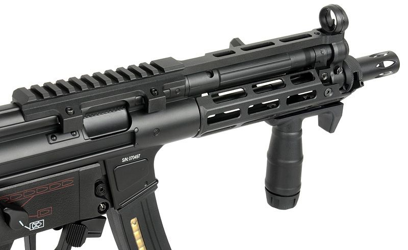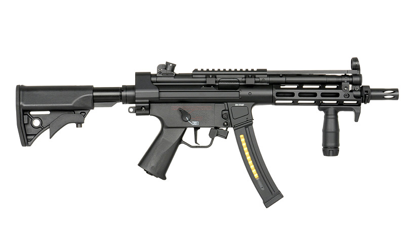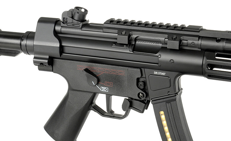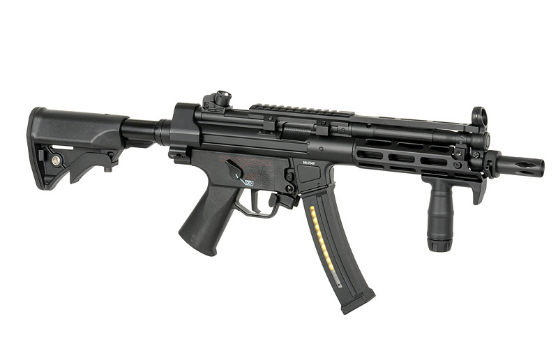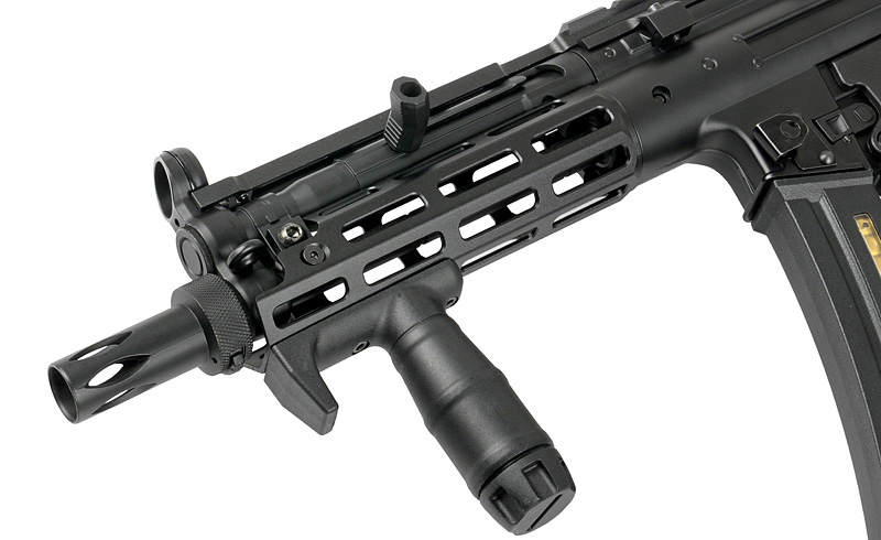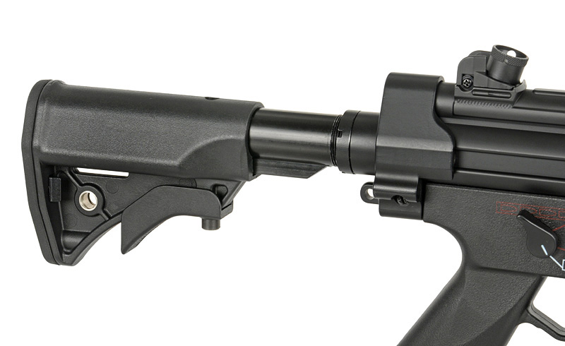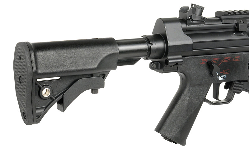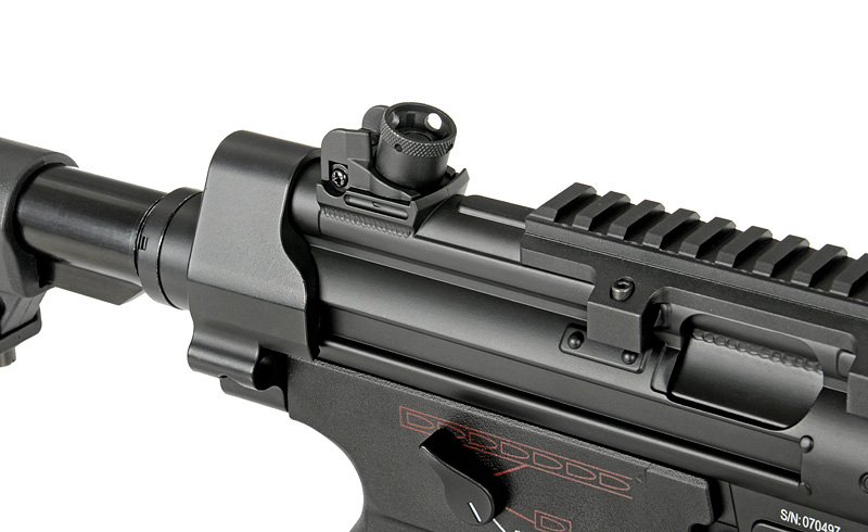 CM.041H is a model of a submachine gun from a new PLATINIUM series, The metal body with the barrel assembly and the nylon pistol grip imitate the material used for the production of real SMGs. The compact design with the telescopic adjustable stock makes it easier to move around in cramped rooms. An Ambi selector lever allows the operating of the replica by both right and left-handed people. In the replica, after pulling the charging handle, the ejection window opens, behind which the adjustment of the hop-up system is hidden. Each model on the receiver has a laser marking in the form of a unique serial number.
