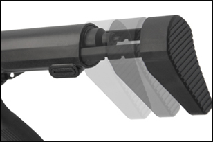 In unique fashion, the stock is a two-position collapsible part with two side button releases to extend the rifle. Adjust the stock to improve the stability in your performance while aiming down range. The battery placement has an easy access for the user and its also located in the rear and covered with a protector. Simply apply full pressure to the side buttons to fully slide out the stock. Squeeze and hold the lower facing button of the protector to gain access to the compartment where you can store a 7.4V LiPo stick battery.