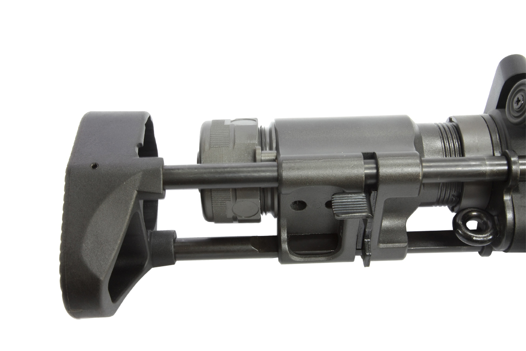 3-Position Sliding collapsible rear stock with a shortened buffer tube.