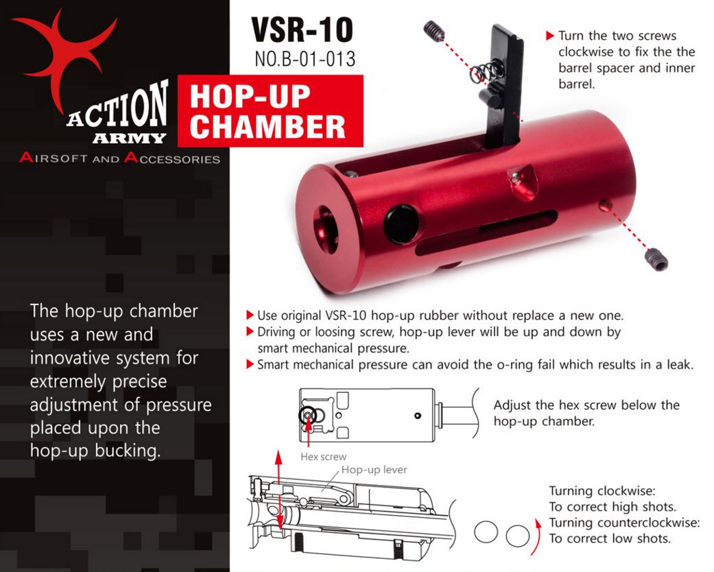 The Hop-up chamber uses a new and innovative system for extremely precise adjustment of pressure placed upon the hop-up bucking