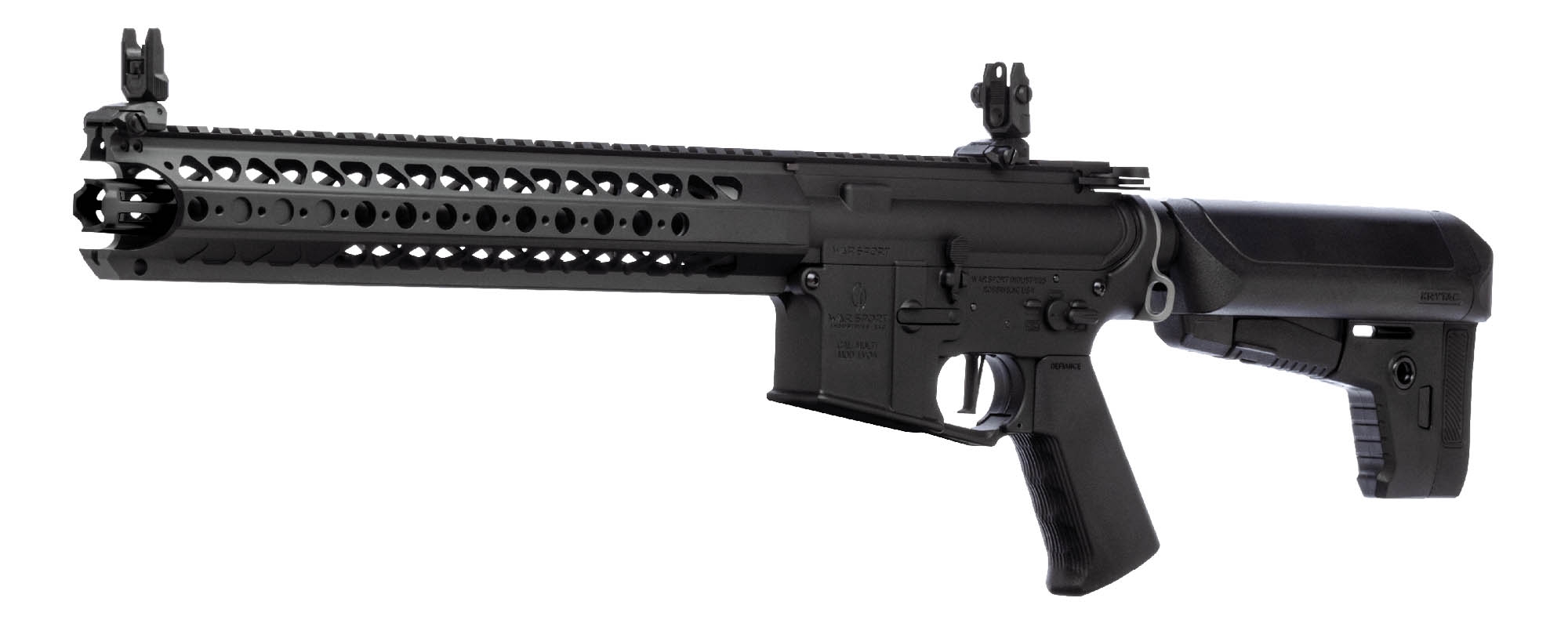 The Warsport LVOA features a reinforced 8mm ball bearing gearbox with integrated MOSFET to regulate electronic signals and to protect the trigger contacts. The corners of the gearbox that surround the cylinder feature a smooth radius, as opposed to a 90 angle, to prevent fracture. Also, the gearbox shell features a small window on the left side where lubrication can be applied directly to the gears or piston, this window is also convenient for inspecting the angle of engagement with the gearbox fully assembled.Additional gearbox features include a modular spring guide system that will allow the spring to be changed without completely disassembling the gearbox. The KRYTAC piston is made of a durable, lightweight polymer and features 4 metal teeth, with the 2nd to last tooth absent. The Cylinder head is padded with an enlarged rubber bumper to optimize the angle of engagement and to absorb energy form the impact of the piston assembly. The material for the gears have been especially formulated to be very strong, Rockwell test figures on the KRYTAC gears are much higher than industry norms. Turning all of the drive train components is the KRYTAC high torque motor, capable of 30,000 revolutions per minute unloaded.